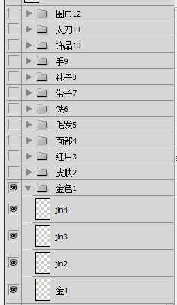 我先从铠甲的黄金部件上起,先用100%透明度和100%硬度的圆头笔刷再新建的图层jin1画上黄色。