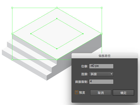 我们着手于墙壁的创建.选择基础的顶面,然后去对象>路径>偏移路径…并设置适当的值(-30px在我的情况下).