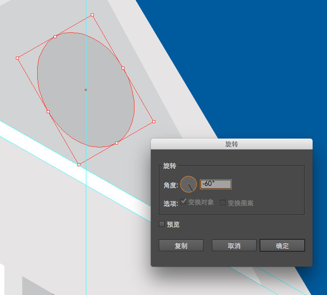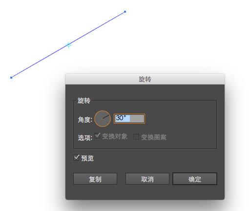 创建2个倾斜的导向,也将有助于我们在进一步的设计.使用直线工具绘制一个水平线段(\).现在去对象>变换>旋转...并在对话框中设置一个30度角.