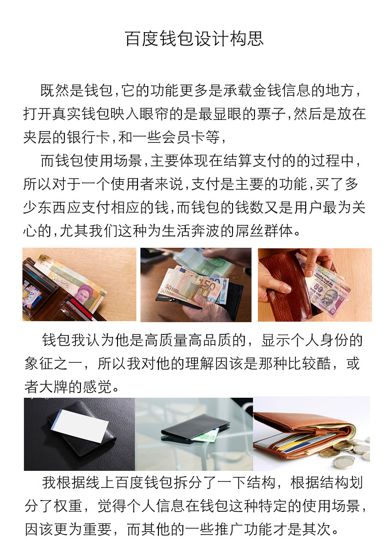15年有那么两天闲来无事,看到百度钱包触屏版的设计偶发一些想法,做了一个钱包改造,年关将至整理发现了它拿出来晒晒,就跟很多人自发的改造12306一样闲的!我修改的方向非常粗暴就当它是一个线上钱包而因该拥有的钱包样子...