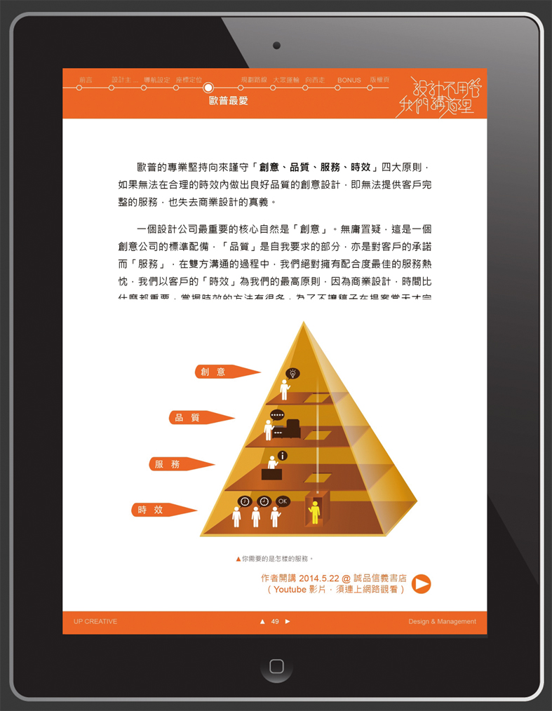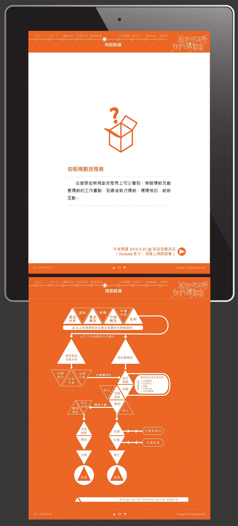 這是一本給創意設計人看的書,我不是什麼管理大師,也無法讓你看完馬上成為大公司,除了這個行業以外,我什麼都不懂,只想把25年來,歐普設計怎麼走過來的點點滴滴記錄下來。為了迎接UP 25th的到來,無意之間在自己公司的粉絲圑內倒數每日計時,撰寫歐普紀實,兩百多個日子來累積今天的此書出版,沒有理論,只是不希望你多走不必要的彎路。以前我只能在一旁看著前輩的身影而爬行,現在資訊充斥,這些只是小菜一碟,請慢慢享用,就從你我忽略的小地方開始,讓我們一起用地毯式的摸索,來探索自己的公司。