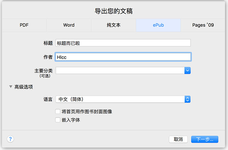 首先,用Pages打开客户给你的文档,然后导出Epub格式,就像下面这样。