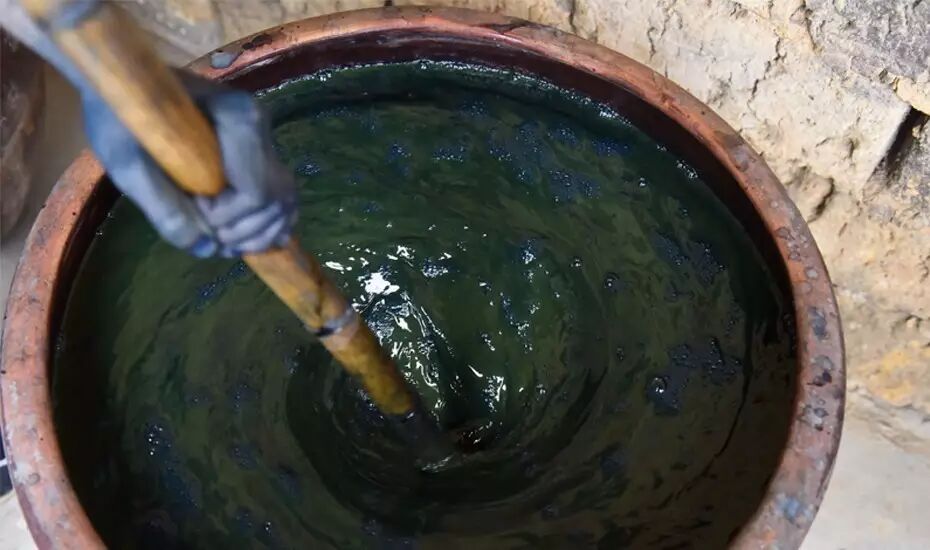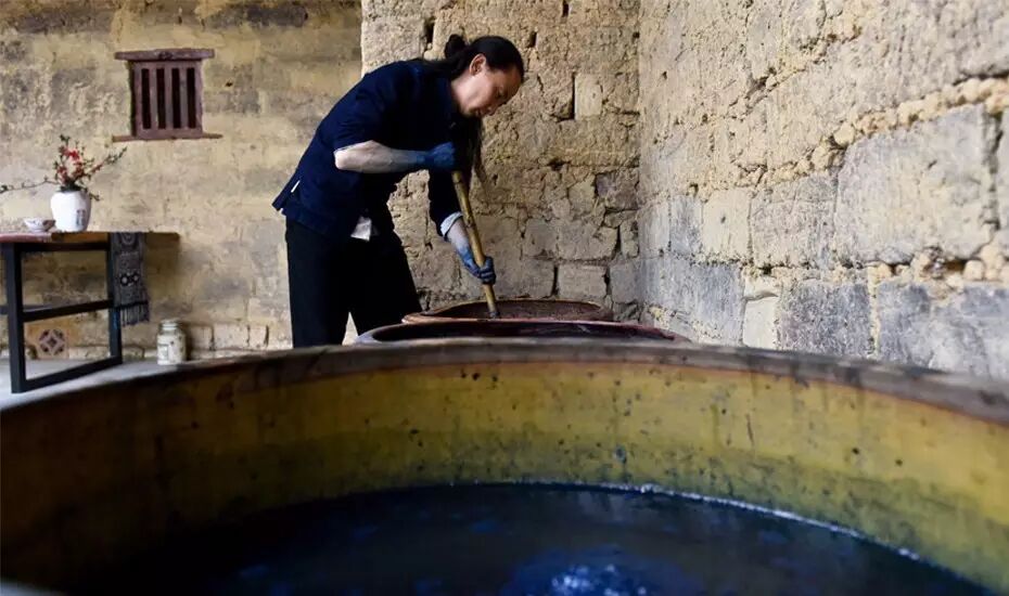 “就像人饿了要吃饭,染水用了之后也要按需增加靛蓝膏。”寒山说,靛蓝膏是由板蓝根的茎、根、叶发酵后,经10多道工序后催化提取而来,几千年前的古人就开始使用它染布。图为寒山用竹棍顺时针大力在加了靛青膏的染水中搅拌。