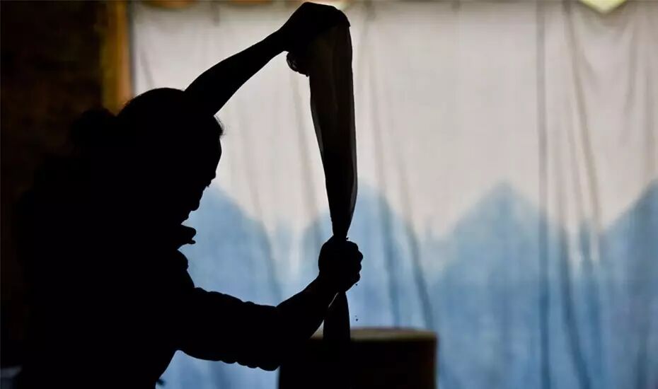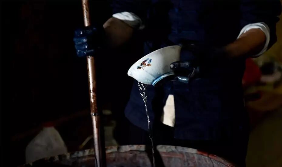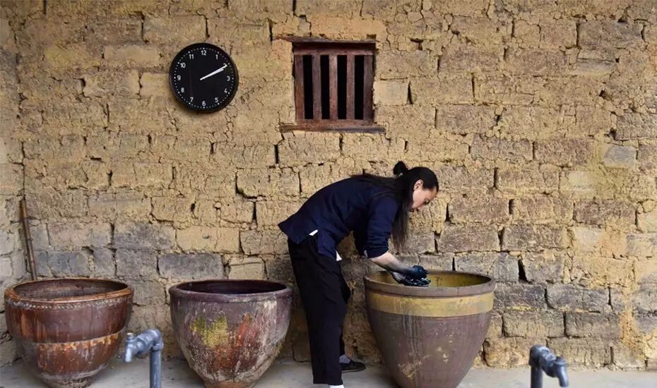 寒山住地有大小近10坛染缸,每一天他都要重复看似平淡枯燥的步骤,确保染水的状态。染水准备好后,先要在头脑中想好需要染出的大致效果,再将浸湿拧干的白布放入染水,浸泡片刻取出来。浸泡和氧化的次数越多,染出的蓝色饱和度越高。图为寒山向加入了靛蓝膏的染水中倒入一碗白酒,染坊里弥漫着酒香味。