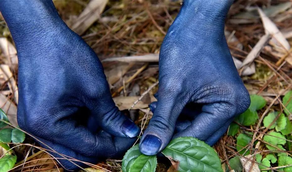 因为日复一日接触靛蓝膏,寒山的一双手也像染布一样,泛着深浅不一的蓝。