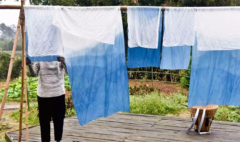 寒山喜欢在白布的不同部位染出不同饱和度的蓝,呈现渐变的效果,温柔沉静,十分耐看。染好布料后,为了防止混色,需要立即进行冲洗,再晾干熨平,经过这样的步骤,一件蓝染布料便初步完成了。