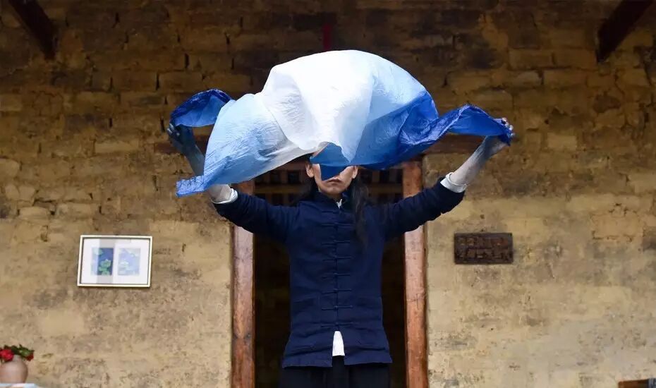 染水准备好后,寒山会取出一条白布,用水浸透。“靛蓝花和云彩代表了染水的生命力”,寒山说。只有日复一日的精心照顾,按需加靛蓝膏和白酒发酵的染水,靛蓝花才会开得越来越好,染出层次丰富、凝重素雅的蓝。