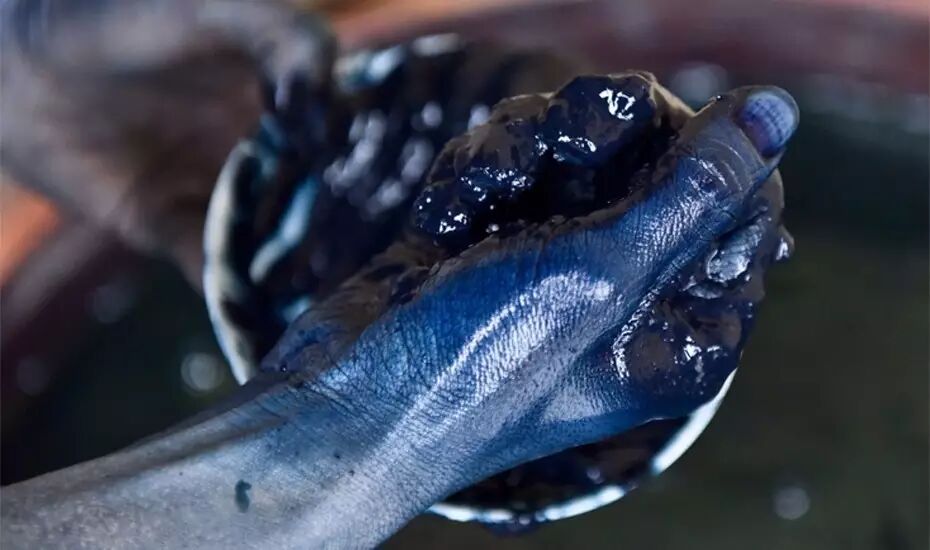 一朵朵的靛蓝花出现在染水表面,快速旋转浮动,生动又美丽。和靛蓝花一起出现的,还有从染水底层泛起的一股股青黄色云彩。