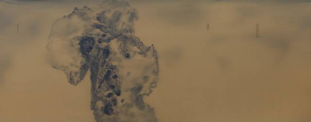 彭斯笔下的山川是一种广义的江山,一种文化意义的山川。在《北山帖》中,山峦的筋脉被成功转化并收录到文人式的画境中一字排开。在《南山帖》中,在转译中重新恢复了一种“古风”的山水魅力,缭绕的云雾从山底环绕至山峰,山体浑然而神秘,再造了一种历史化的遥远和静穆。在《孤月帖》中,一座远距离的精神化的山川在宽阔的构图中与孤月隐动,描述了一种“远意”。《寒松帖》截取一棵斜侧的苍劲野松,《龙影图》在硬气挺拔的刚劲中展现了旷古长虹与寂然的玄雾。《双松帖》则以近景明晰的劲松返现了远景的虚缈之境。在《德石图》中,厚重的画底上显现出赏石与品格的关联。《怀云帖》在“石怀云而无像,松啸风而有言”的诗意中引入了画外之境,在看得见的左右双石之外,勾勒了怀云无像之感和松风之言,在山石的密实与云雾的流动中实现了一种“物的对话”和“人的追怀”。中国文化中相信万物的“气”和世界的流转,在可视的山川固体与看不见的流体中,注重内在自我与外在造化的呼吸与通流,形成了独特的山水观,这些美学的精粹在彭斯的媒介转换中都得到了恢复和再创造,他实现了重构山川的一场诗的旅程。