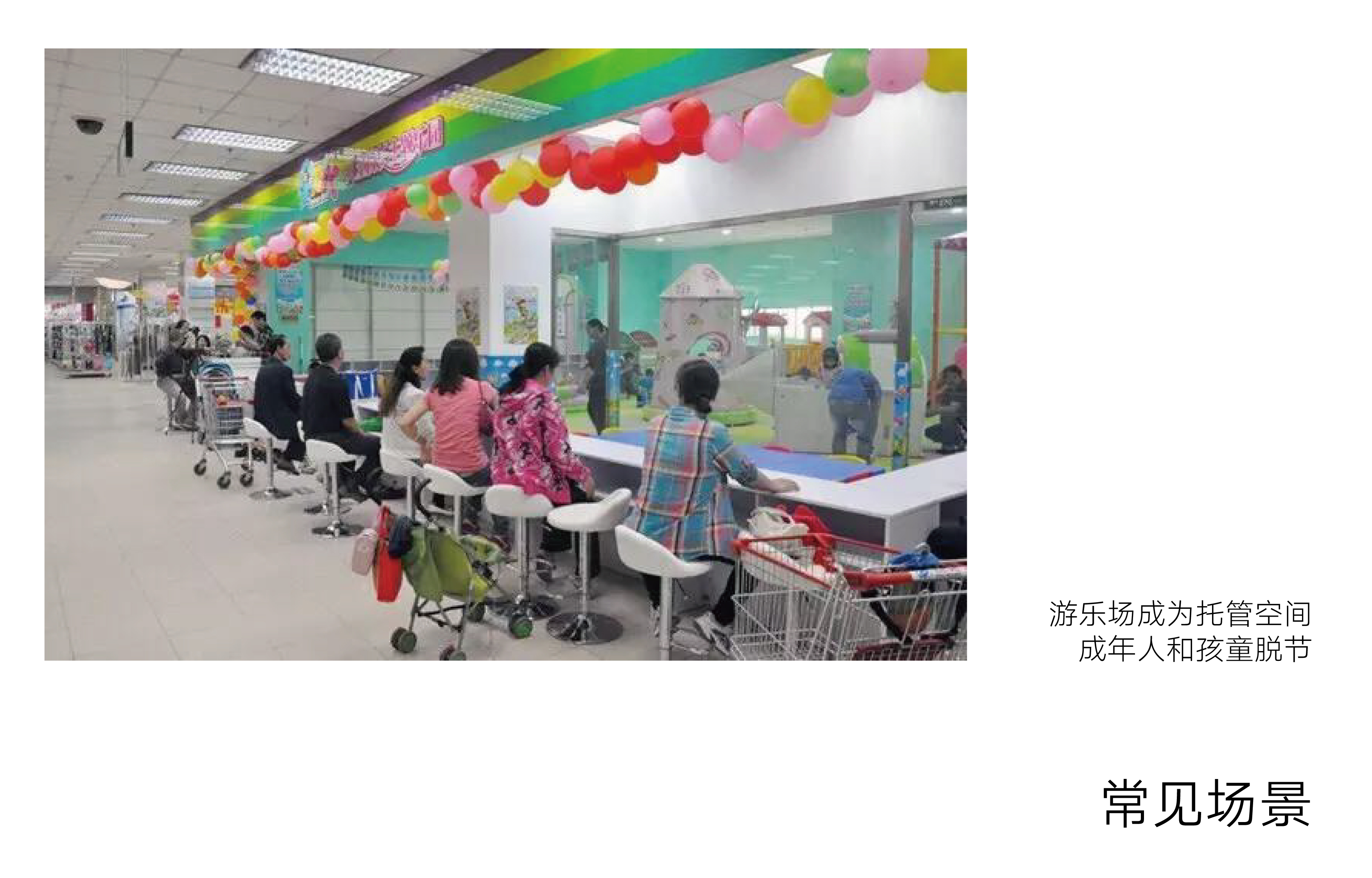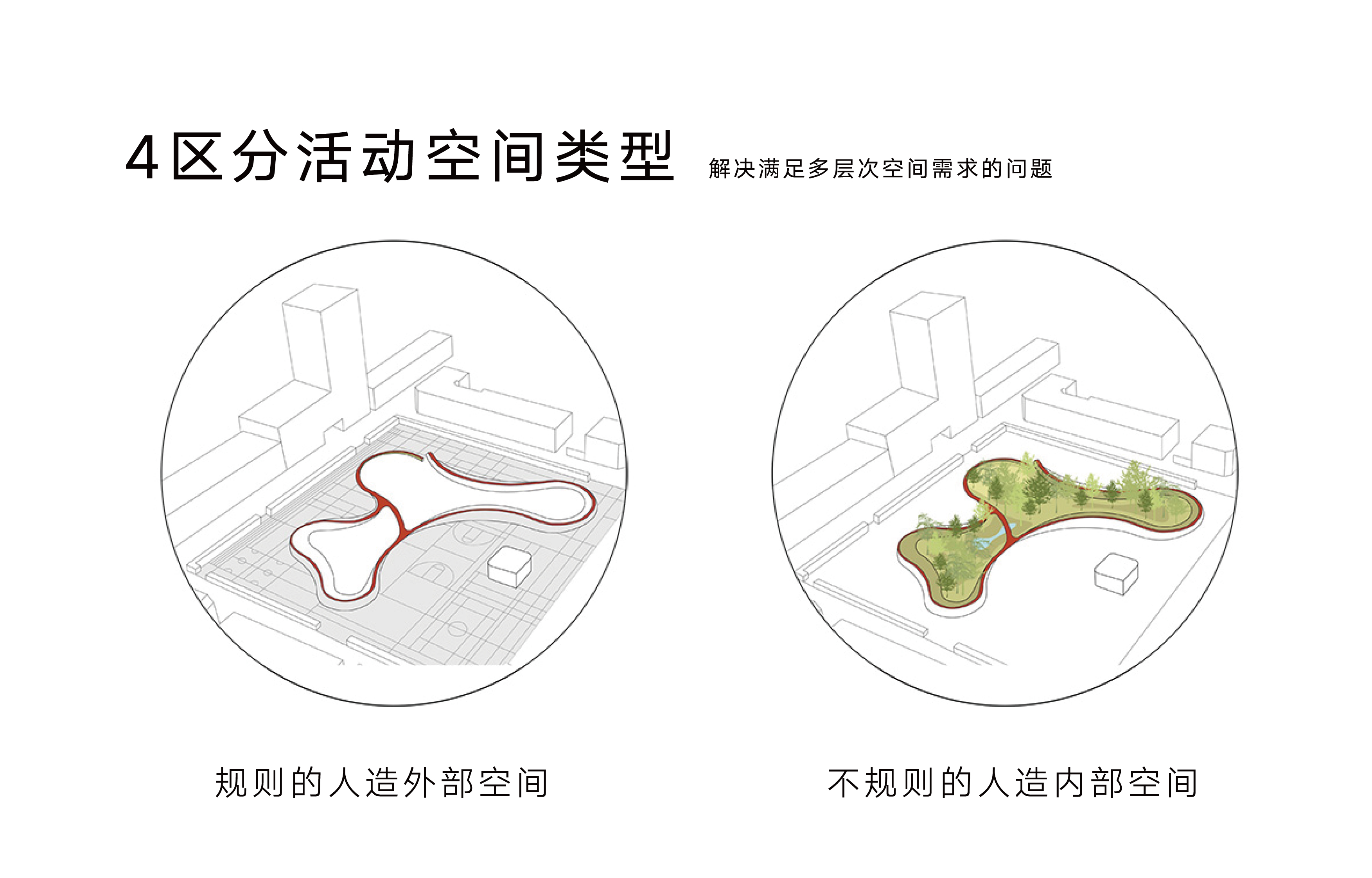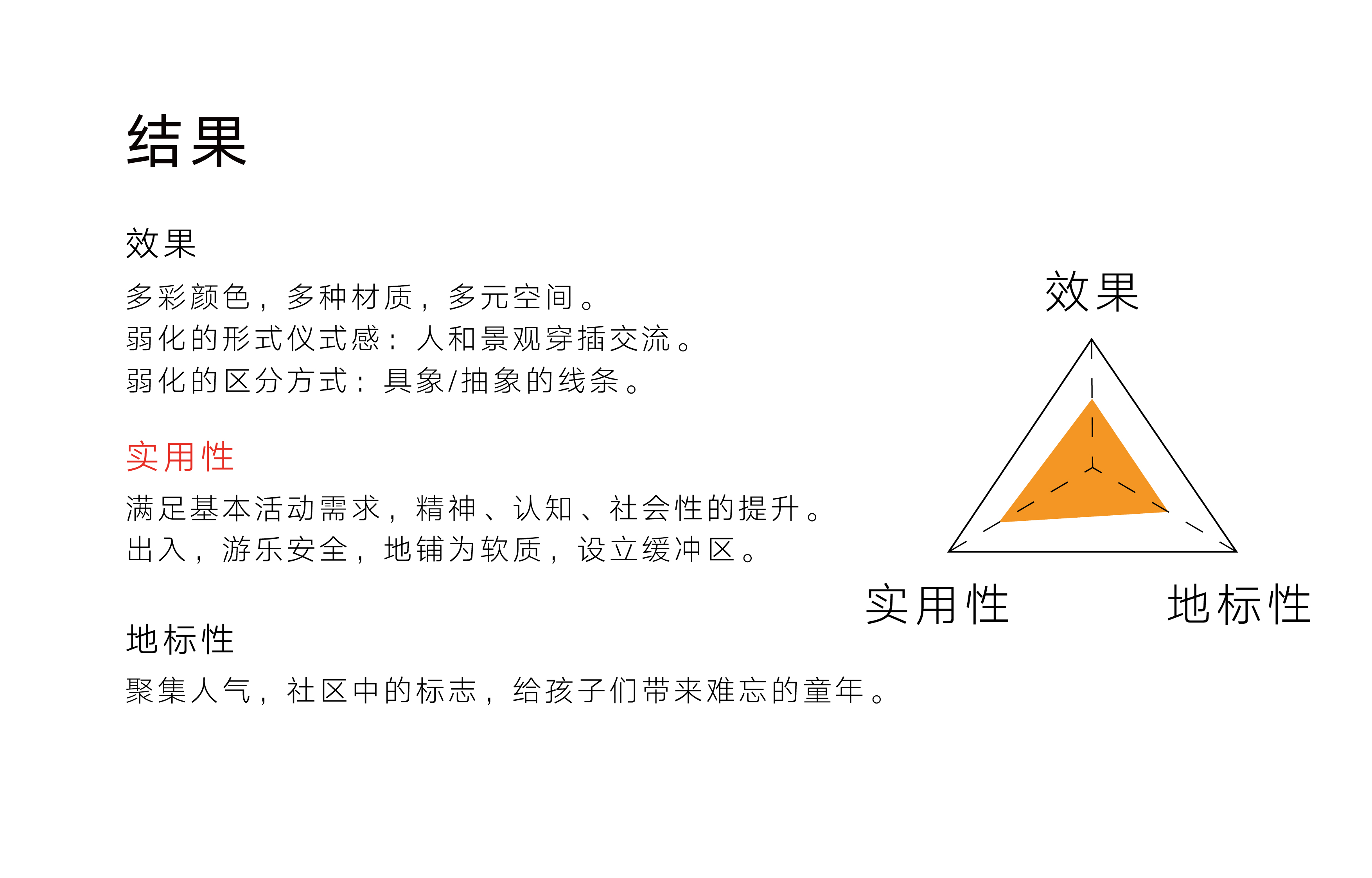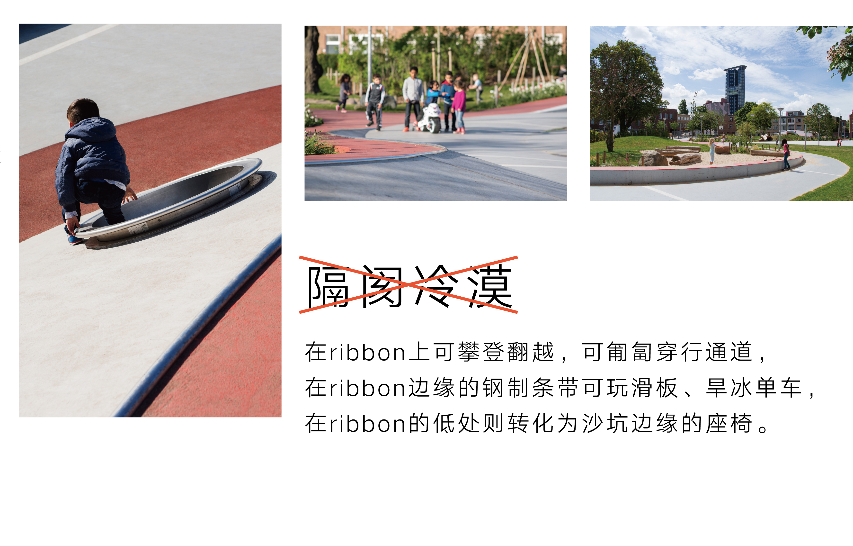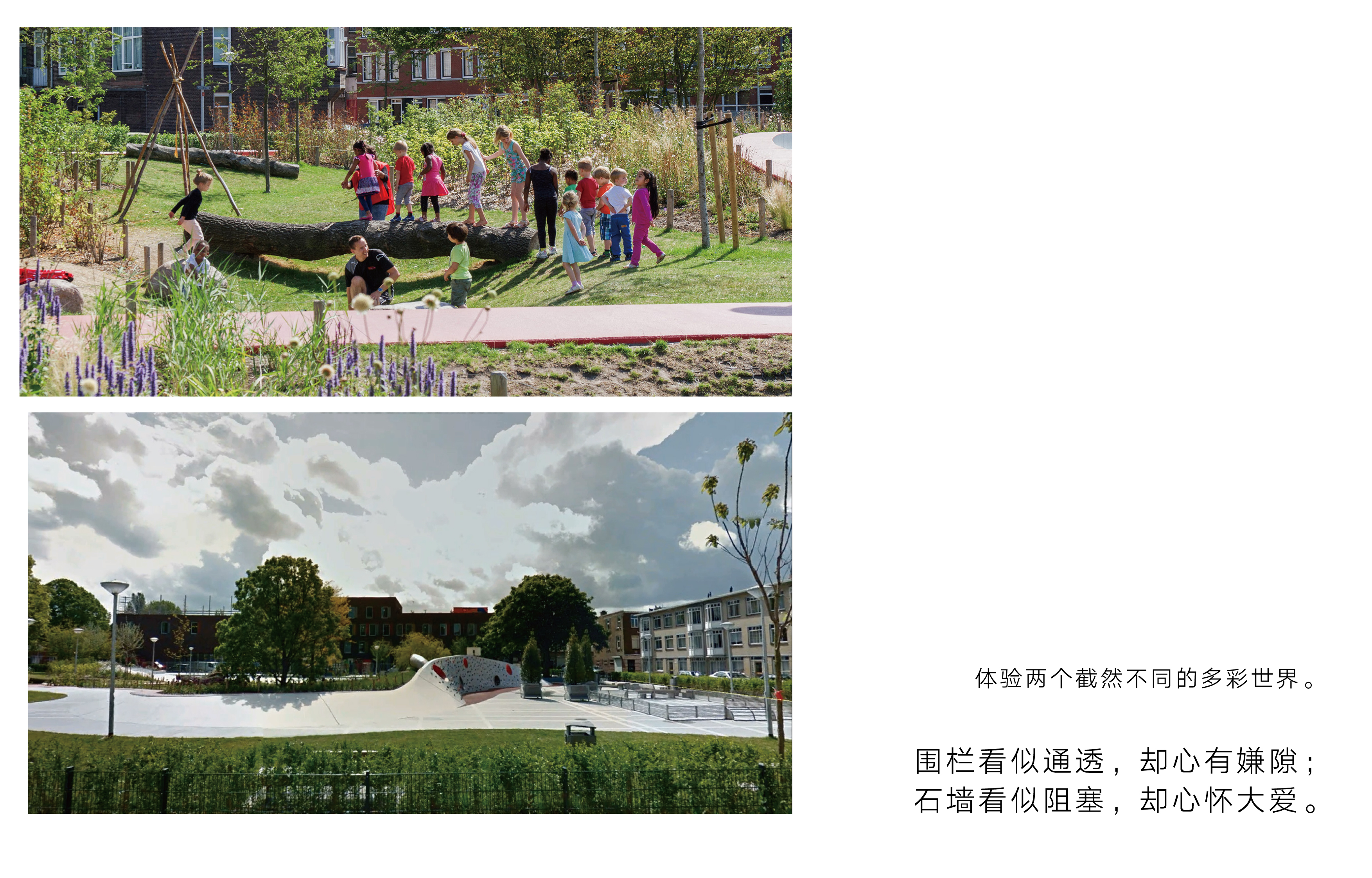 城市广场中时常可见家长与孩童一同出行,城市广场可以作为每个家庭闲时散步的目标点和聚集点。在高密度的城市中预留开放场所已所属不易,而在广场之中提供儿童与成人游玩的并行空间,提供一处能够让陪护者共同游乐,共同活动的空
