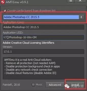 2、运行【AMT Emulator】或【Adobe Universal Patcher 2014.V1.1.中文】选择对应的软件版本,注意目前用cc 2015版本也能破解,2017尚未出来,