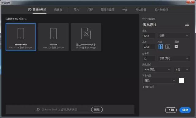 另外界面下方还有前往Adobe Stock查找模板的功能,既然有模板那就大大降低了使用难度,相当于内置了素材网站,直接到素材网站、模板网站甚至是论坛,不过都是国外的,打开速度不敢恭维了。素材很多都是免费的,adobe再一次造福广大设计师,一定要一如既往地支持PS,拒绝sketch(哈哈)。以后新建文件时不再发呆,PS不再是死板的工具,将要给予我们灵感的源泉。