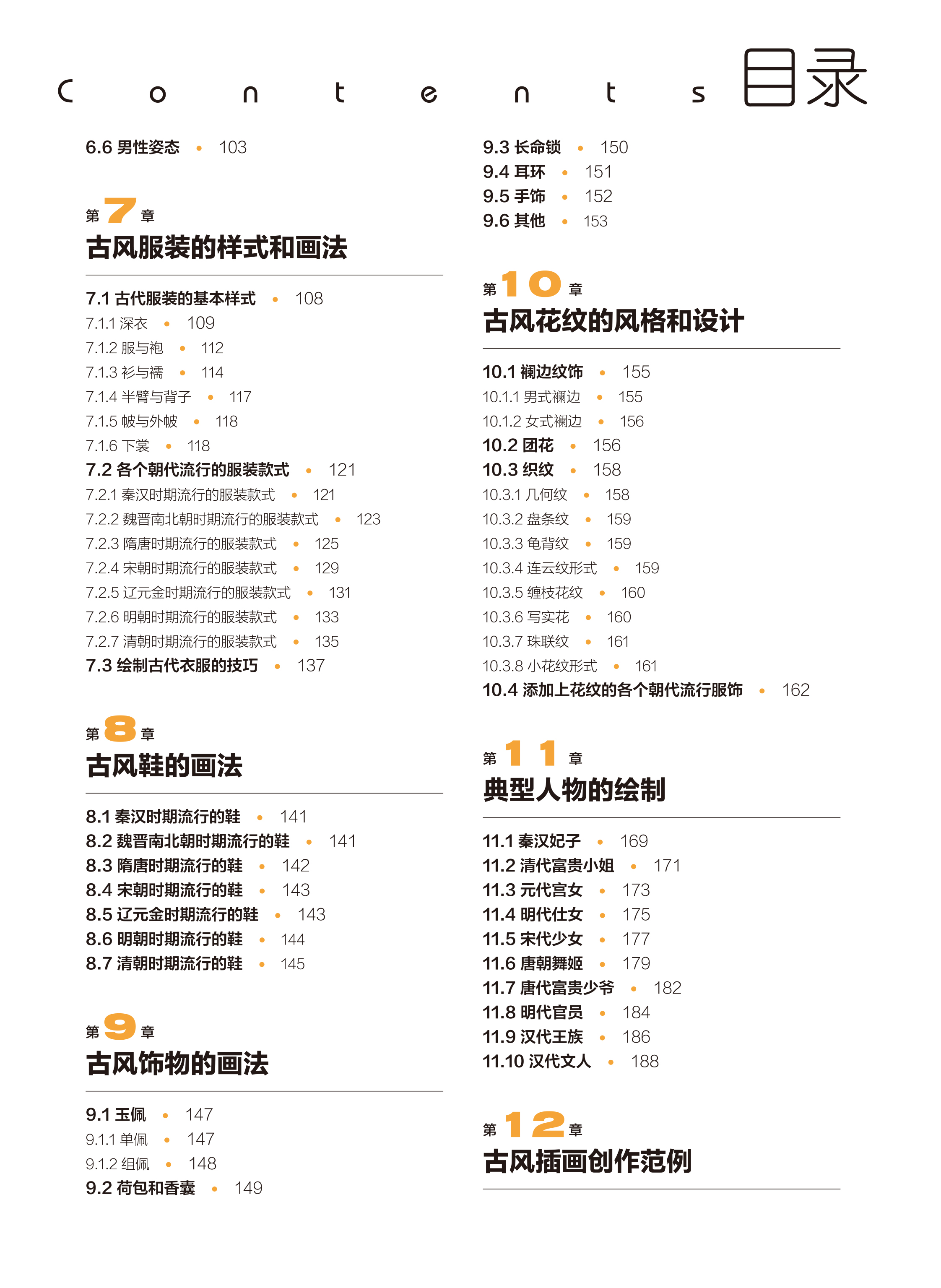 本书详细讲解了学习古风插画绘制的方法。全书分为12章,第1~2章总体介绍了古风插画的风格,以及绘制工具和作画的步骤;第3~4章从人体的基本比例开始到整个头部的比例画法,逐步进入到古风人脸的基本妆容画法;第5章首先介绍了古代主要的几种发饰,再根据史实介绍各个朝代男女的流行发饰及其画法;第6章讲述古风人物的各种常见动态和手势;第7~10章讲述不同朝代的衣物款式类型及全身装饰佩戴的画法;第11~12章综合前面章节所学内容进行实例讲解。