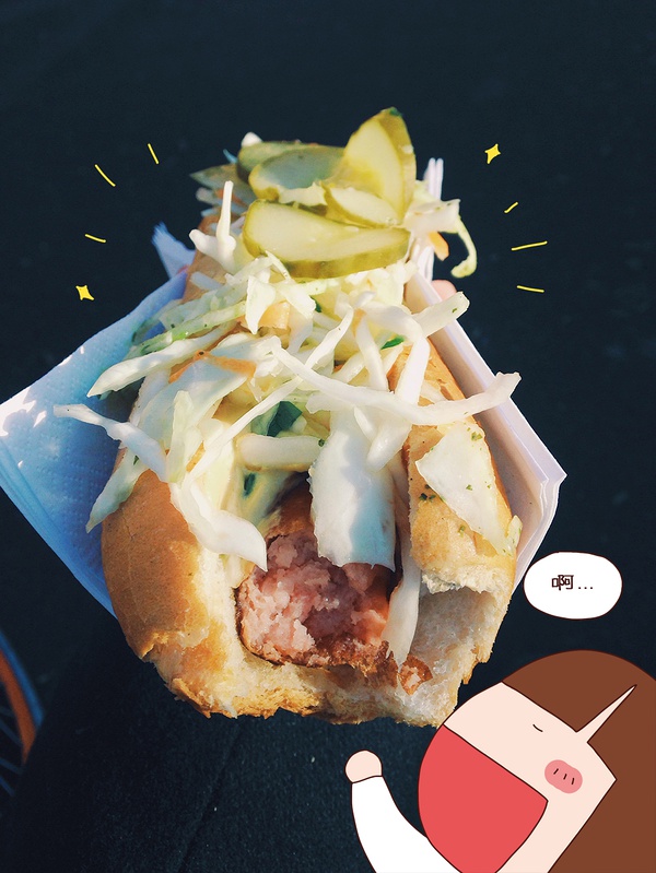 最后我选了香肠汉堡,意外的好吃呢!香肠的肉感满满,外表被烤得有点焦焦的,包裹着的汉堡面包也十分新鲜,咬上去好柔软噢!最惊喜的是可以自己随便加的腌黄瓜,因为我自己本身就很爱吃腌黄瓜,加进汉堡里更是加分,心中有一个声音默默的说着:耶!选对了!