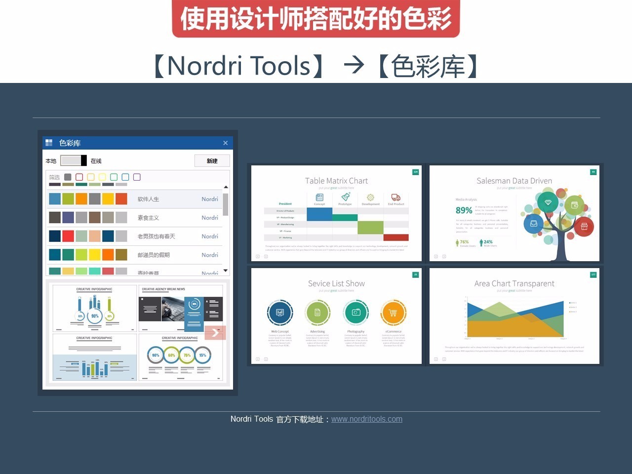 PPT 中自带很多内置的主题颜色可以选择,如果不够的话,可以试试 NT 插件中的色彩库功能一键化替换主题色彩。( NT 插件的介绍和下载)