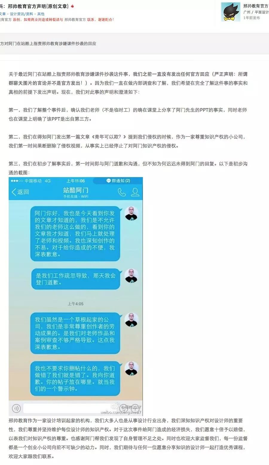 邢帅教育作为一家设计培训起家的机构,我们大多人也是从事设计行业出身,我们深知知识产权对设计师的重要性,我们尊重并坚持维护每位设计师的知识产权。对于这次事件给阿门造成的经济损失,我们愿意十倍予以赔偿,以表我们对知识产权的尊重。也感谢阿门帮我们发现了自身管理不足之处。同时也欢迎大家监督我们,每一份监督都是一个创业小公司向前不可缺少的动力。同时,我们期待与任何一位愿意分享知识的设计师一起打造优秀课程,欢迎大家跟我们联系。