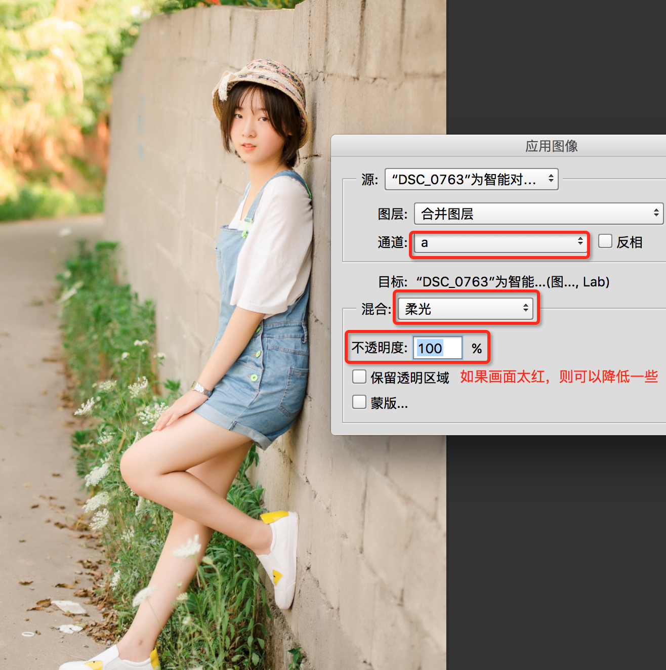 然后弹出这个对话框,在这个对话框中我们一般将通道改为a,混合模式改为柔光,不透明度一般比较少改动,如果你觉得画面太红就将不透明度降低: