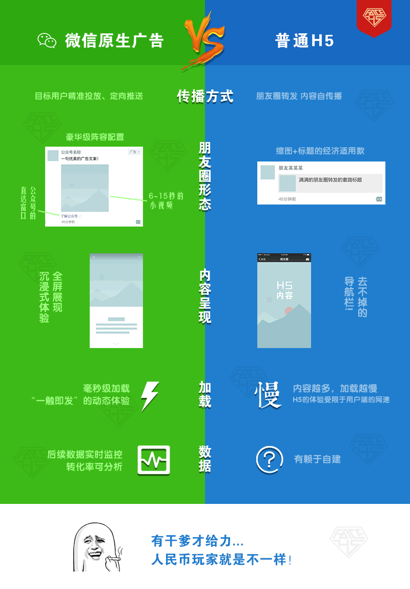 微信针对原生广告提供了诸如:文字、图片、轮播图、全屏视频、嵌入式视频、360全景图等多样化的表现形式,一定程度助力H5的竞争由技术创新跨度升级为内容竞争!