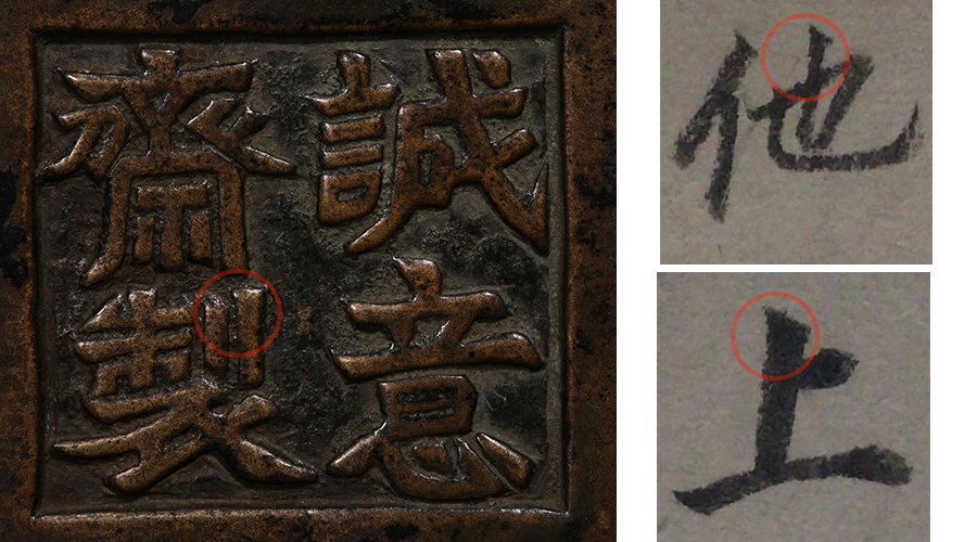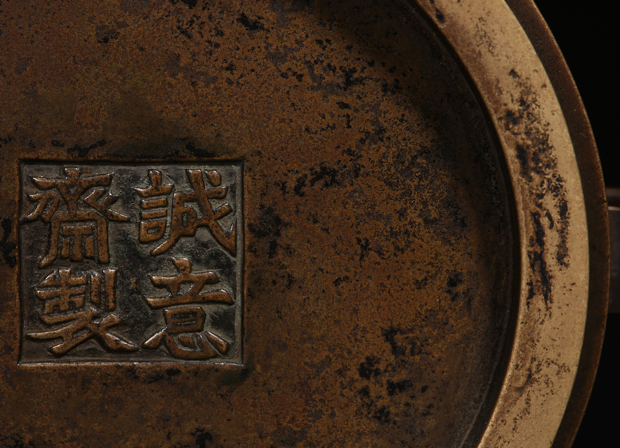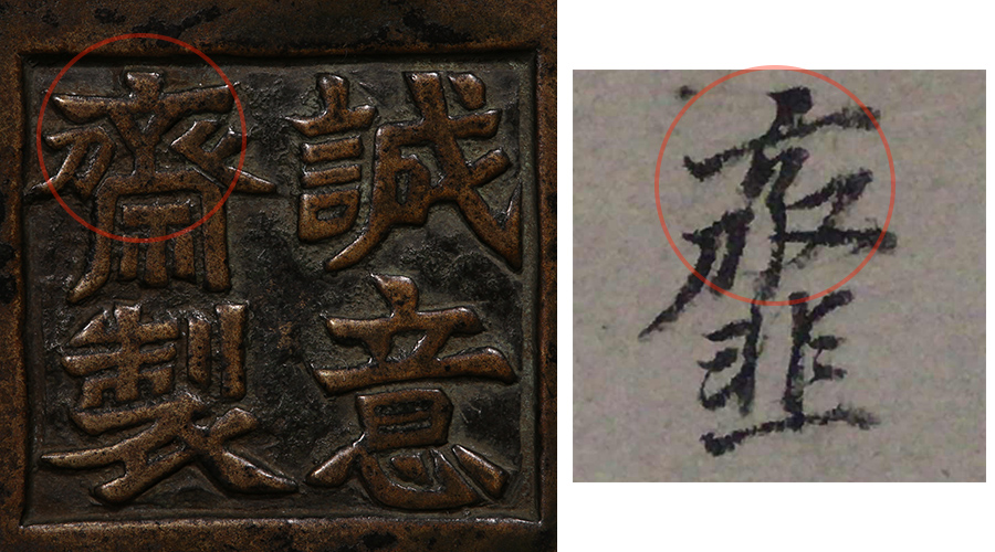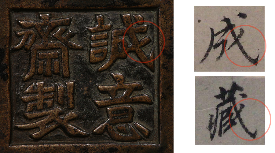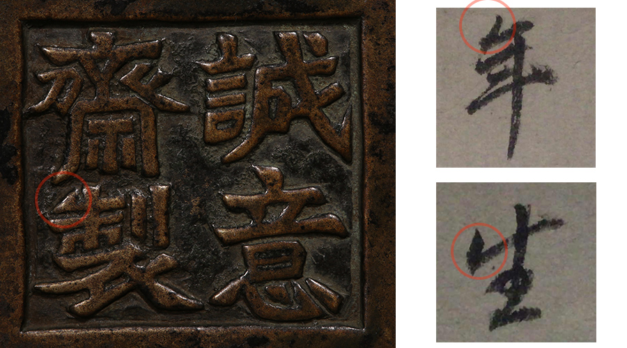 底款楷书“诚意斋制”四字,一笔一划简单明了,整体平衡稳重,细节上的处理十分精彩,笔画虽粗重,却没有沉重的感觉,反而透露出一丝洒脱,符合明代书法的特征。