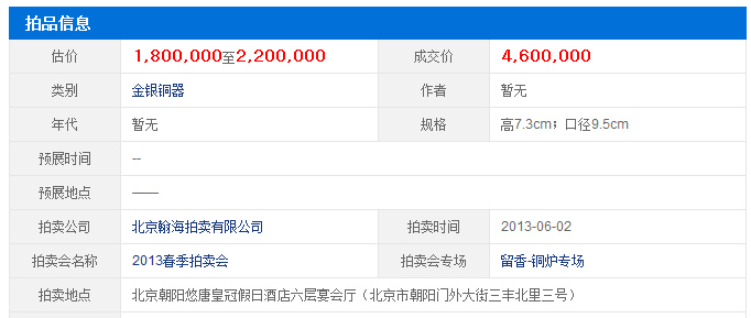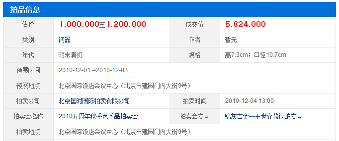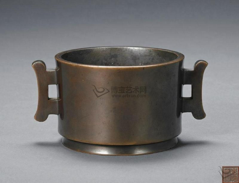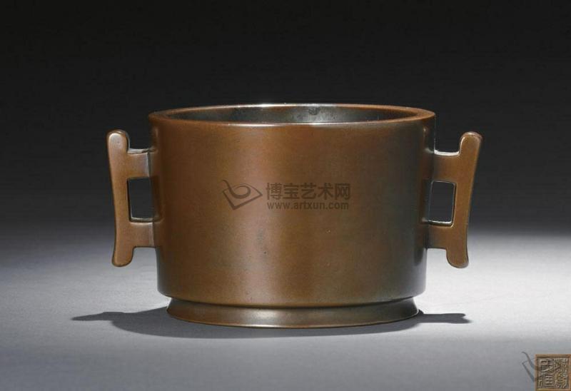 宣德炉近几年成为收藏热点,价格高歌猛进,同造型的私家款戟耳簋式炉在国内的拍卖价格也十分惊人。