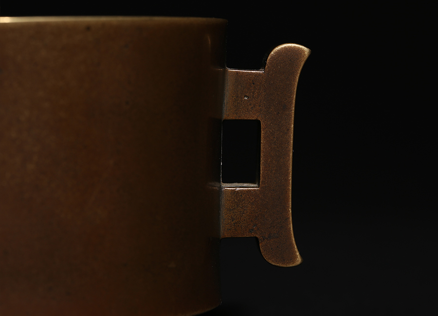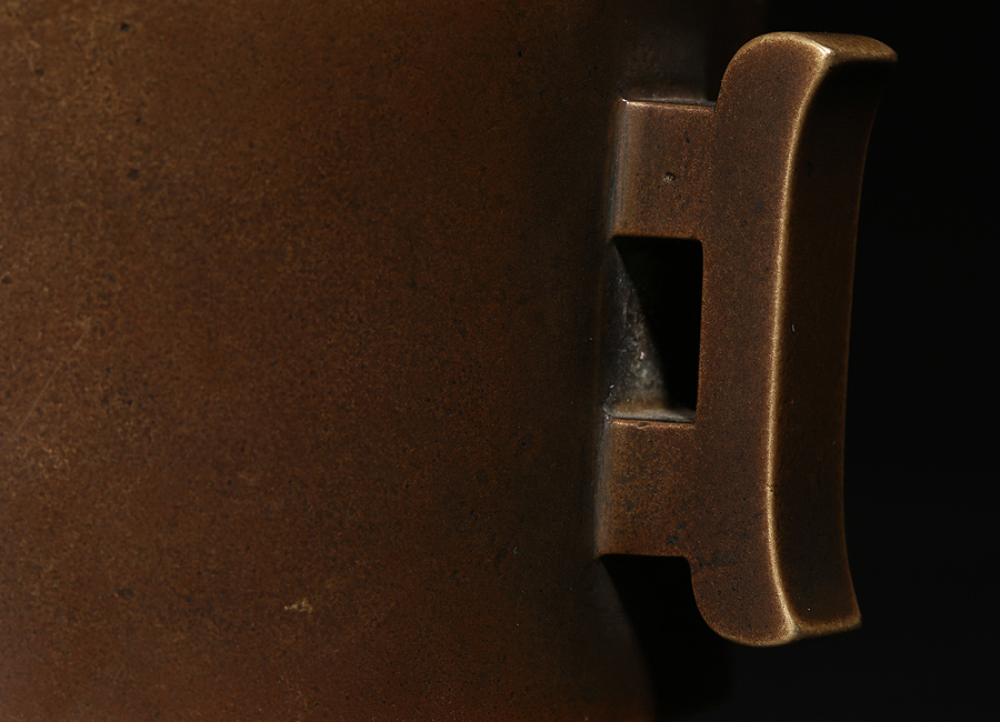 整体造型,炉身将簋的器型简化凝练成桶型,底部微微收足,最简洁的方式保留了簋的基本特征。两耳则采用了方正的形状,类似古兵器戟,立边的弧形设计以及边角的圆滑处理使得方形两耳与圆形桶身统一起来,整体器型威严沉稳。