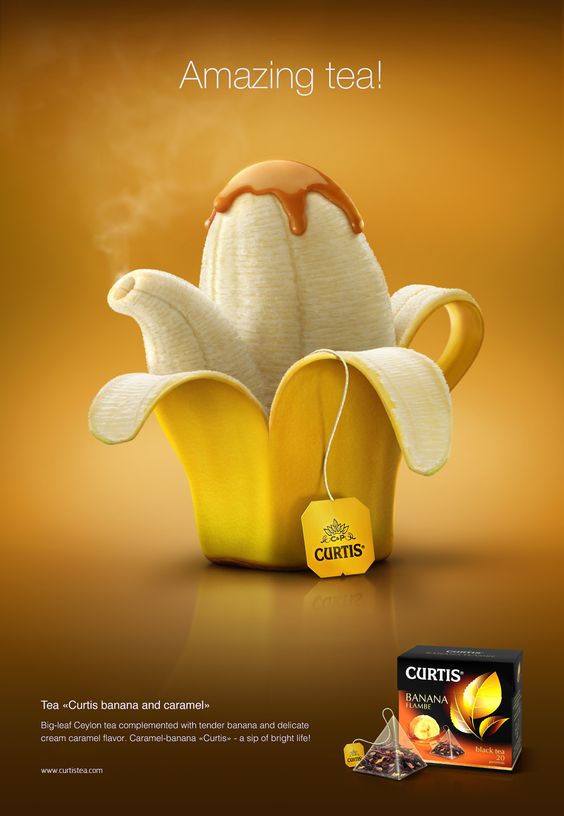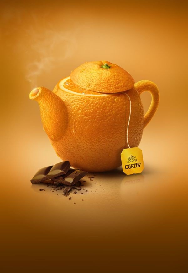 这个广告由柯蒂斯茶选择用视觉语言来展示他们的茶的香味和口感,而不是直接告诉顾客。 他们完全可以简单地在页面上添加一些文字说“这个茶拥有非常非常强烈的橙子香味”,但是他们选择通过将橙子变成茶壶的形状来传递以出他们的茶拥有非常强烈的橙子香味。