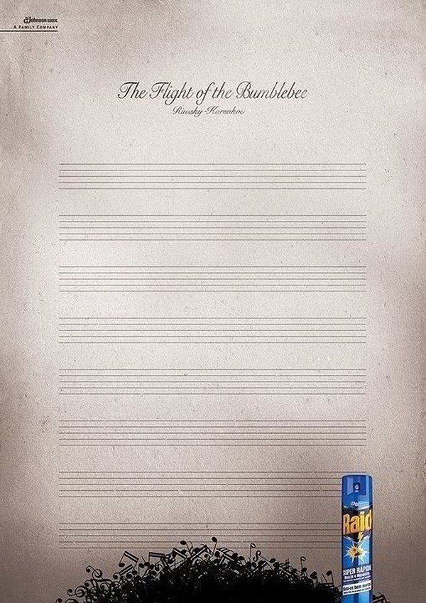这个Raid杀虫剂的广告,用 产品“杀死”了著名音乐家——Rimsky-Korsakov谱写的“大黄蜂飞行”的音符(把音符比作扰人的蚊虫),意味着Raid杀虫剂足够强大,可以消除任何虫子。 这个广告看似很荒谬,但是这种如此明显的不真实会让人觉得搞笑,而不是欺骗或误导。