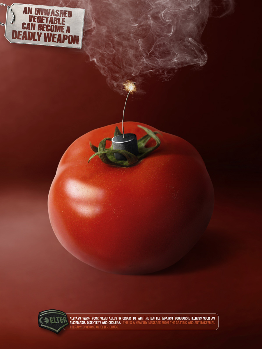 这个广告通过把一个未洗的洋蓟比喻成炸弹来警告公众食源性疾病的危害。 通过创建一个视觉比喻,Elter药业公司能够传达有关食品安全和Elter药物自己的抗菌治疗部门的强烈信息,而不显示任何敏感的图像。