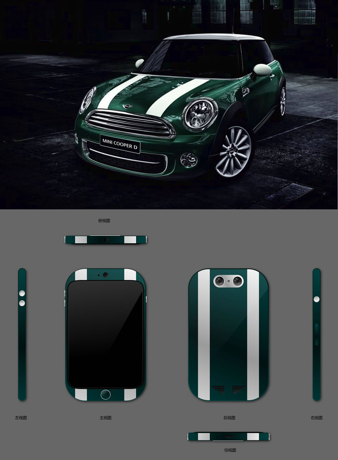 MINI——相对比较好设计,圆润到底,不管车型,大灯,内饰,所有东西都是圆的。手机的所有按键包括听筒也全部设计成圆形,背部特意设计了一个飞鹰翅膀形状的喇叭口,与MINI的标志相呼应。