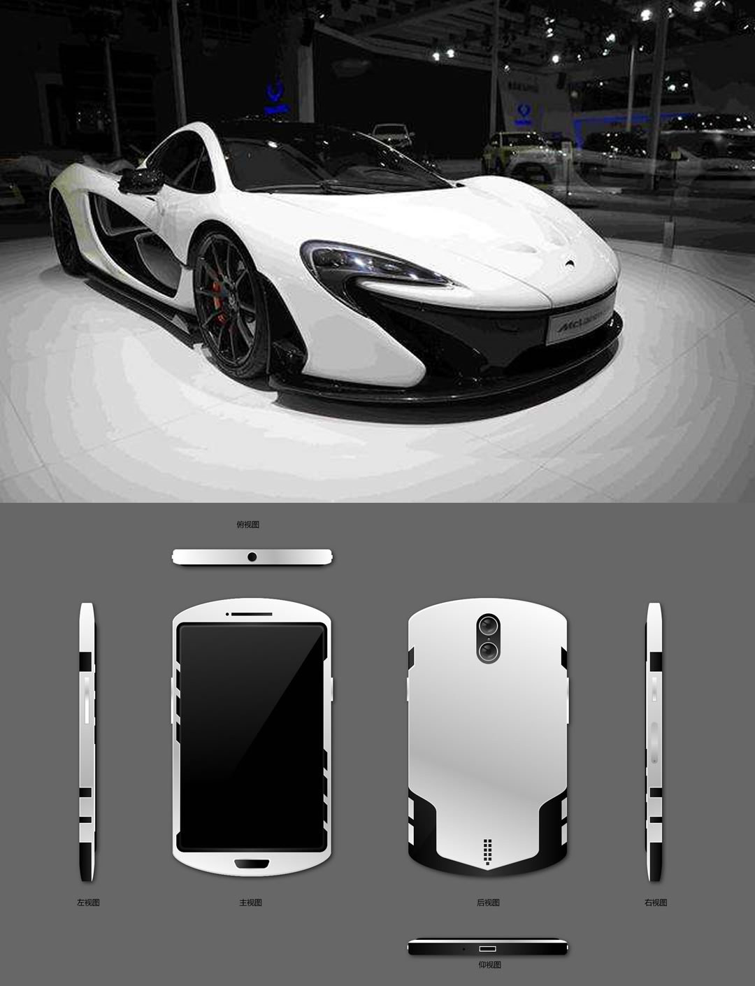 迈凯伦——由于还要考虑手机实用性,所以很难把跑车的流线型设计到手机上,最终只用了车头弧度,车位部分的设计。