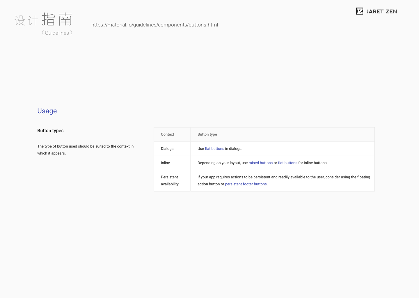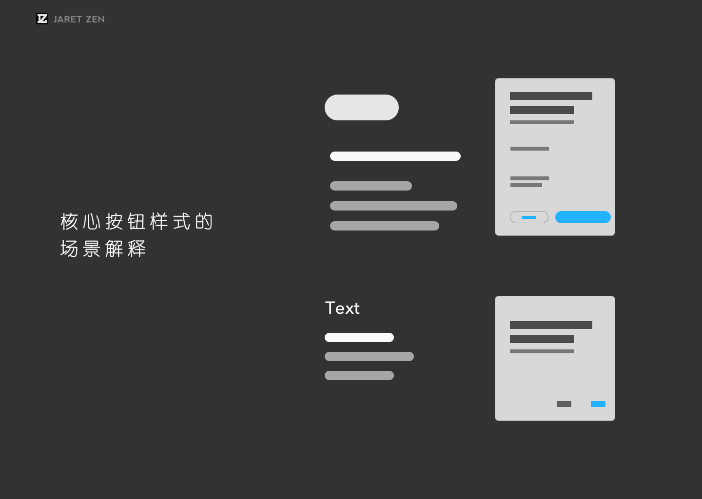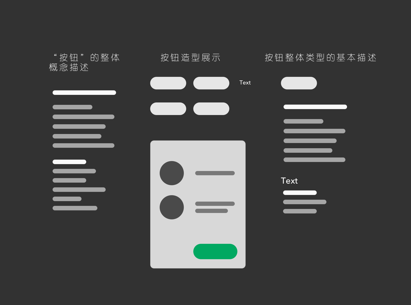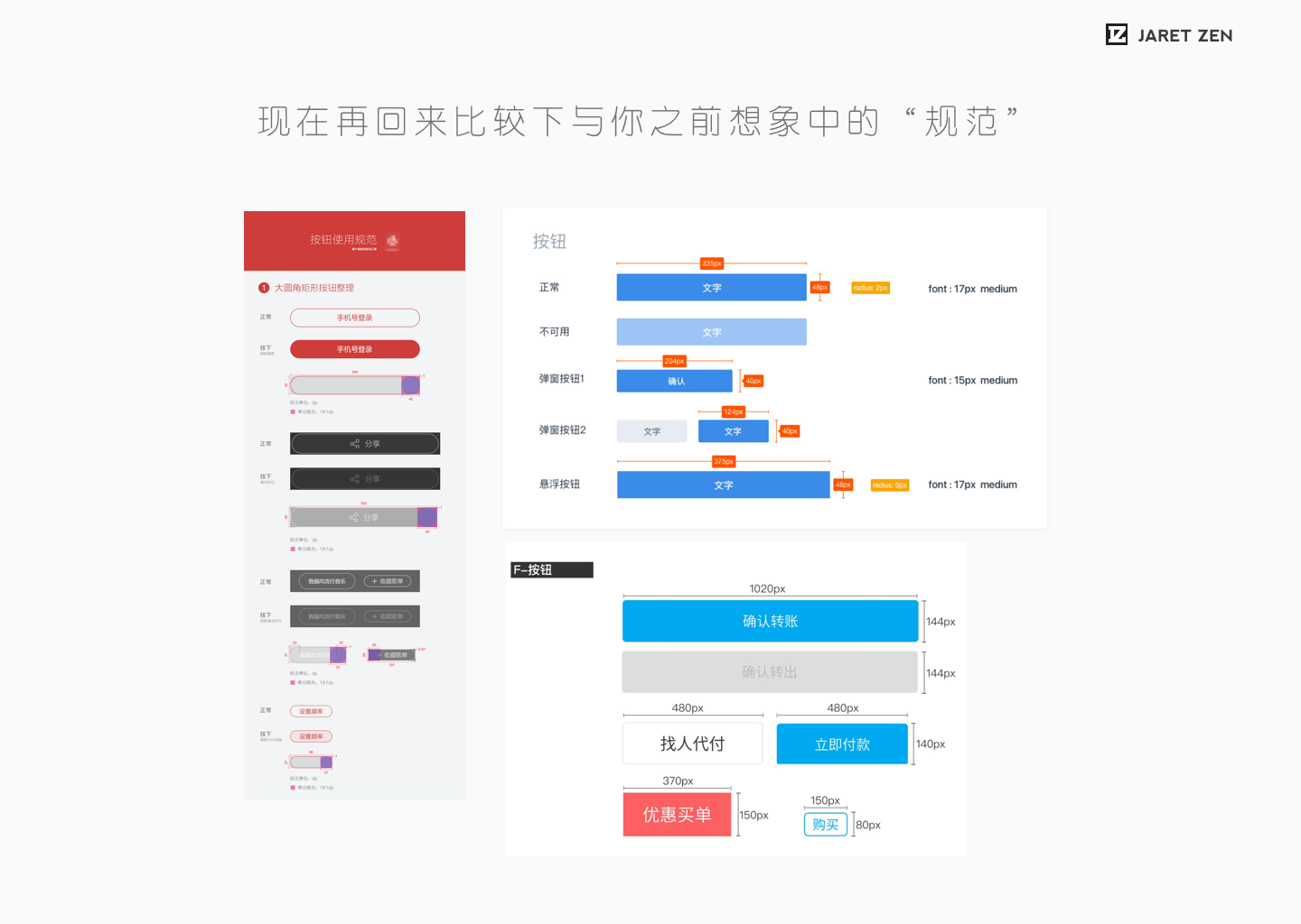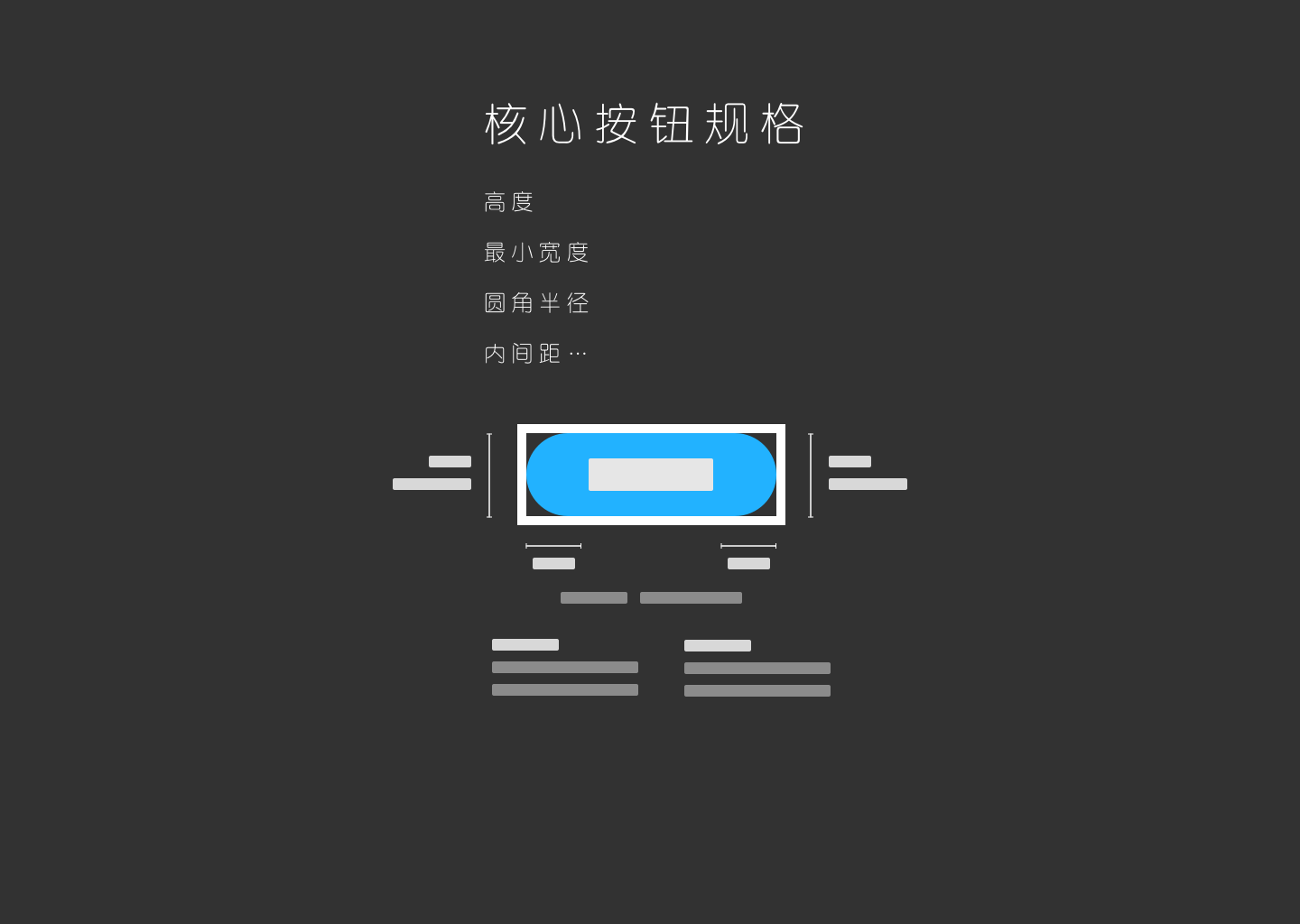 我在阅读到从网上分享平台中搜索出大部分的关于“按钮规范”的这一部分时,发现这两类呈现方式在理解和实际工作中有着明显的差异,前者像是一种产品和信息传递的媒介,后者更像是一种写给自己的关键数据备忘。