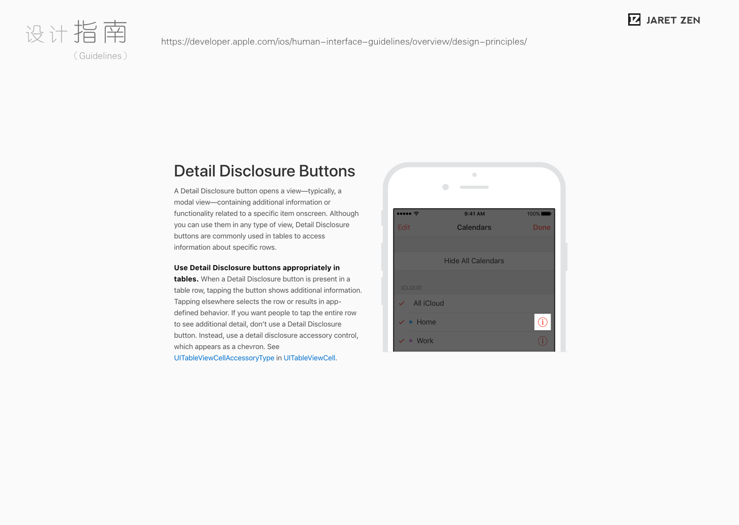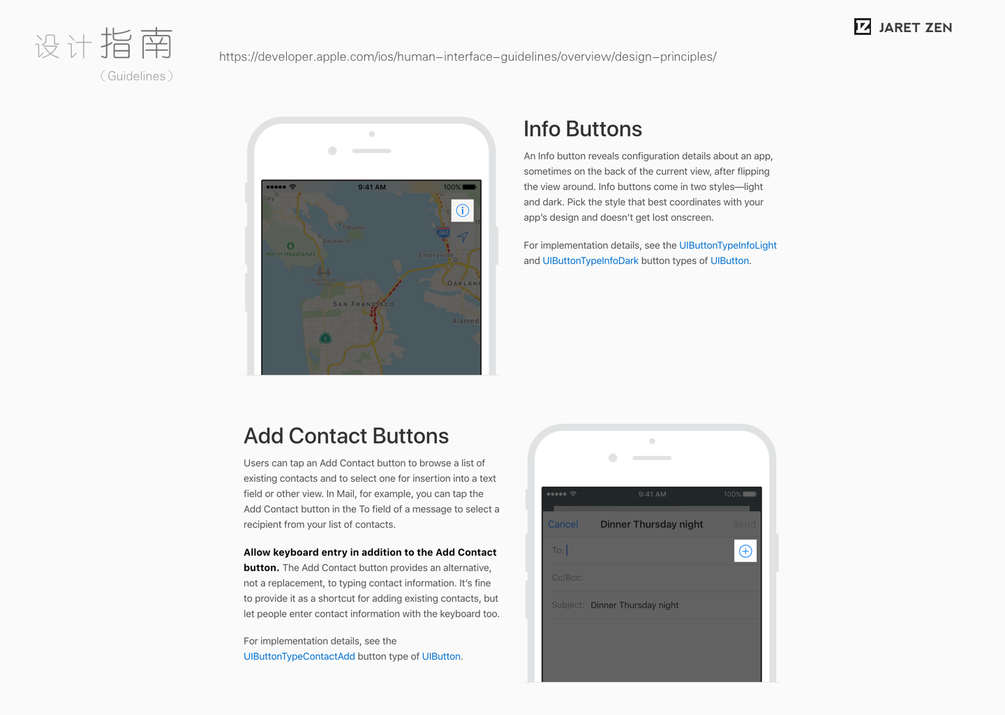 同样,苹果的iOS人机交互指南中也简单的大概描述了一些几个典型按钮的作用。(但和Material Design的指南比起来还是属于比较含糊和笼统的。)