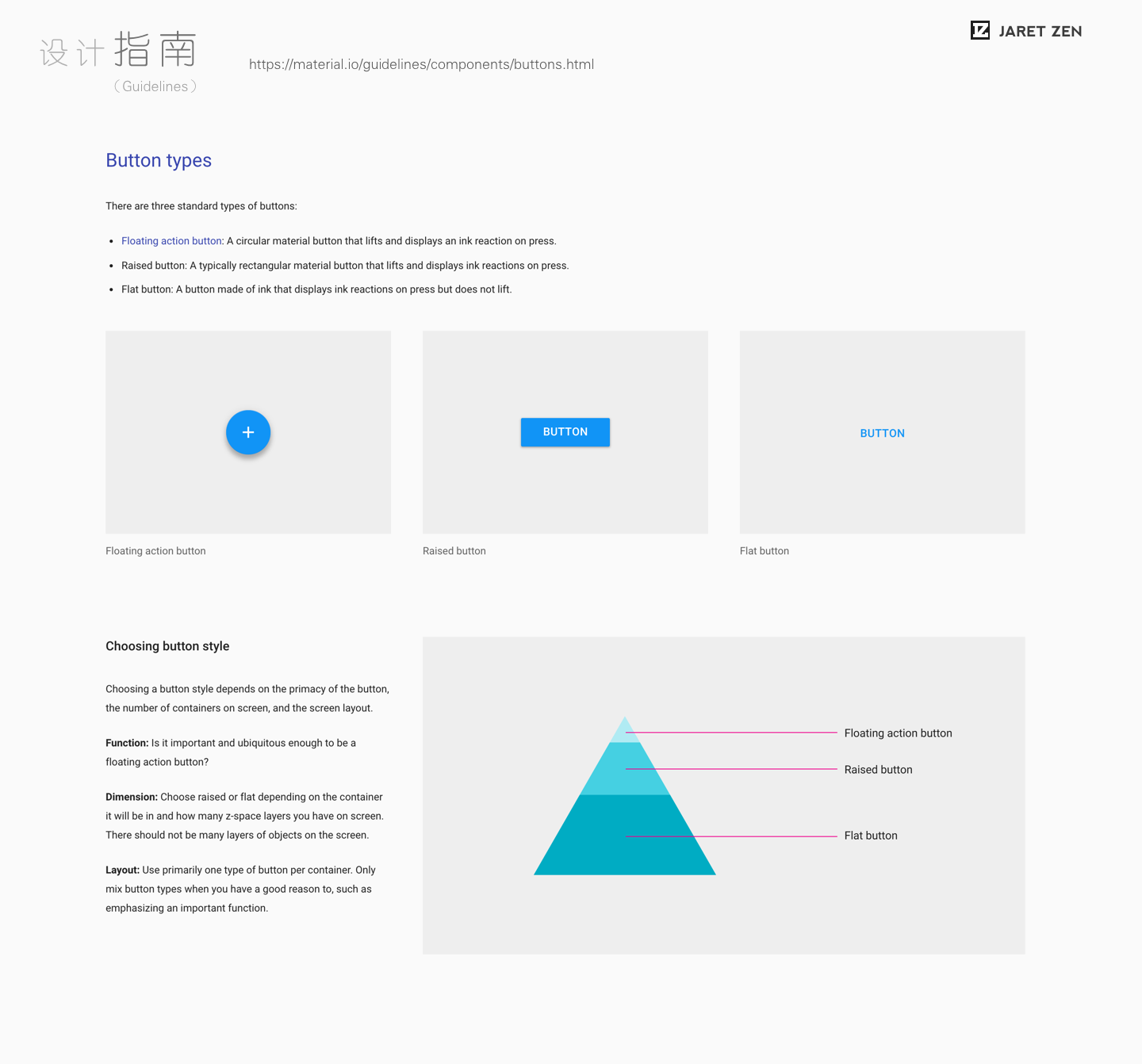 在Material Design中,“按钮”的“指南”部分先大致阐述了“按钮”主要的几个类别,以及各类别在整个产品环境中所使用的频次概率以金字塔的方式呈现出来。并提供了几个简单但典型的场景表述。