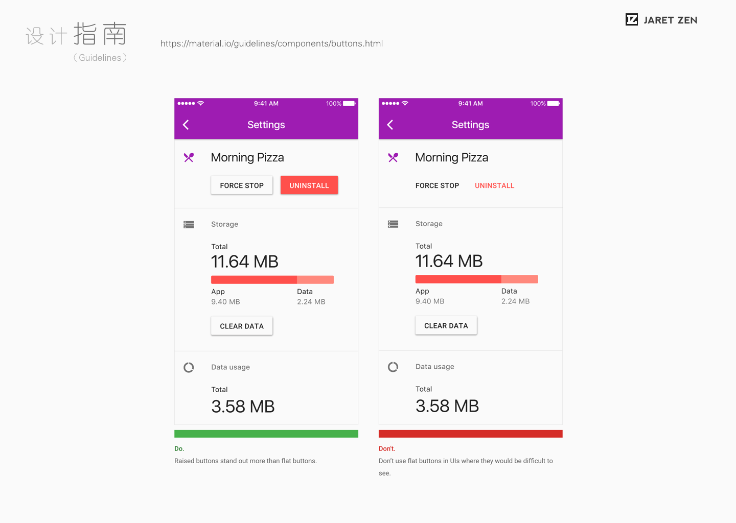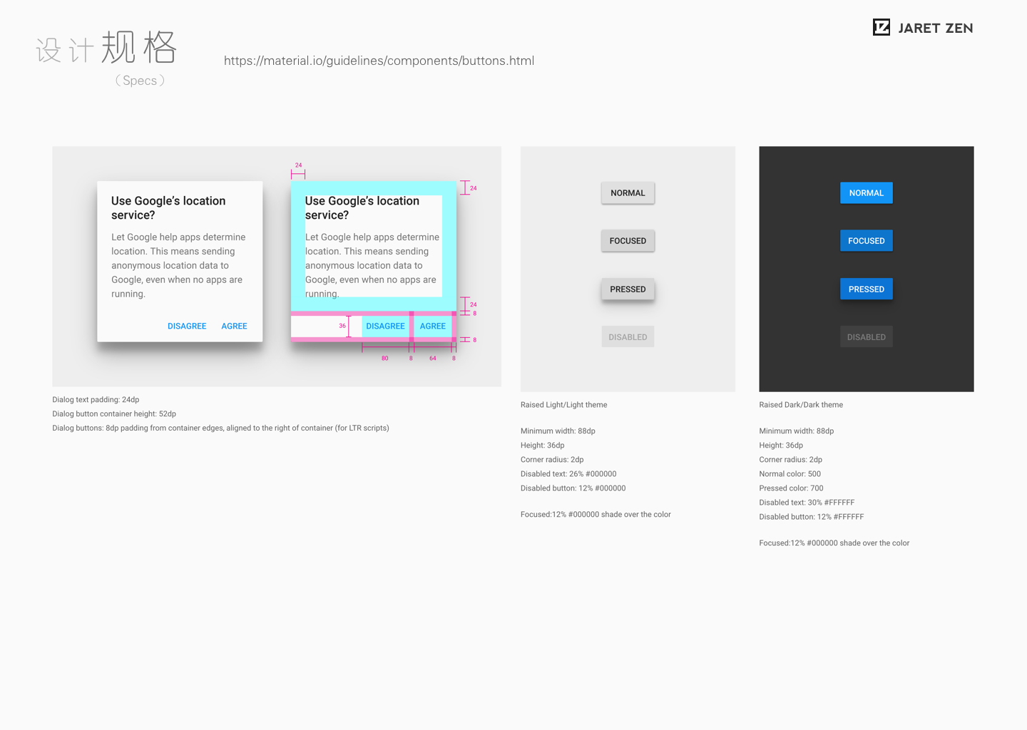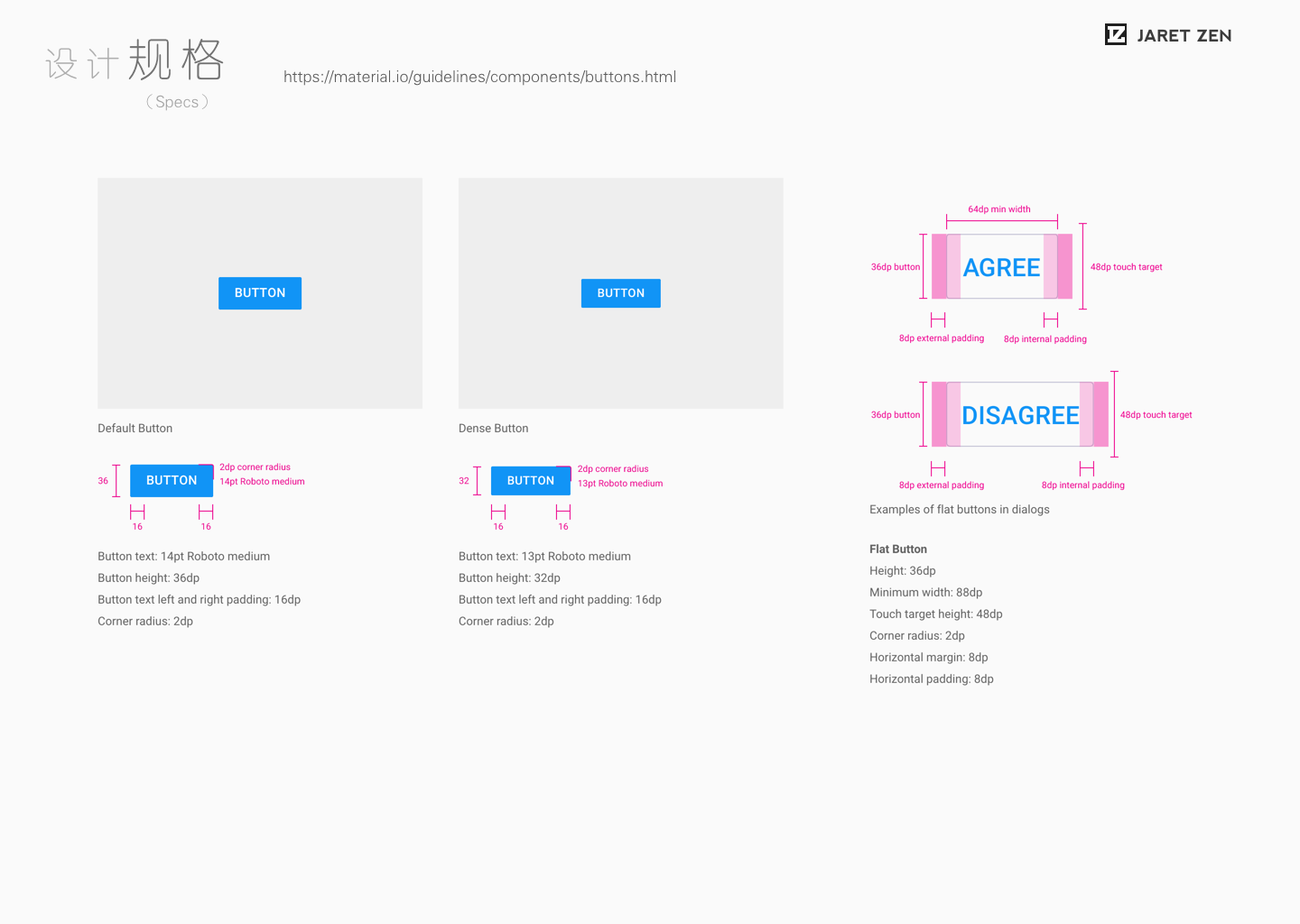 在“设计规格”中,Material Design把“规格”中的原则性也尽可能的表述了出来。比如建议(至少)的最小尺寸,按钮所属的文本属性等。