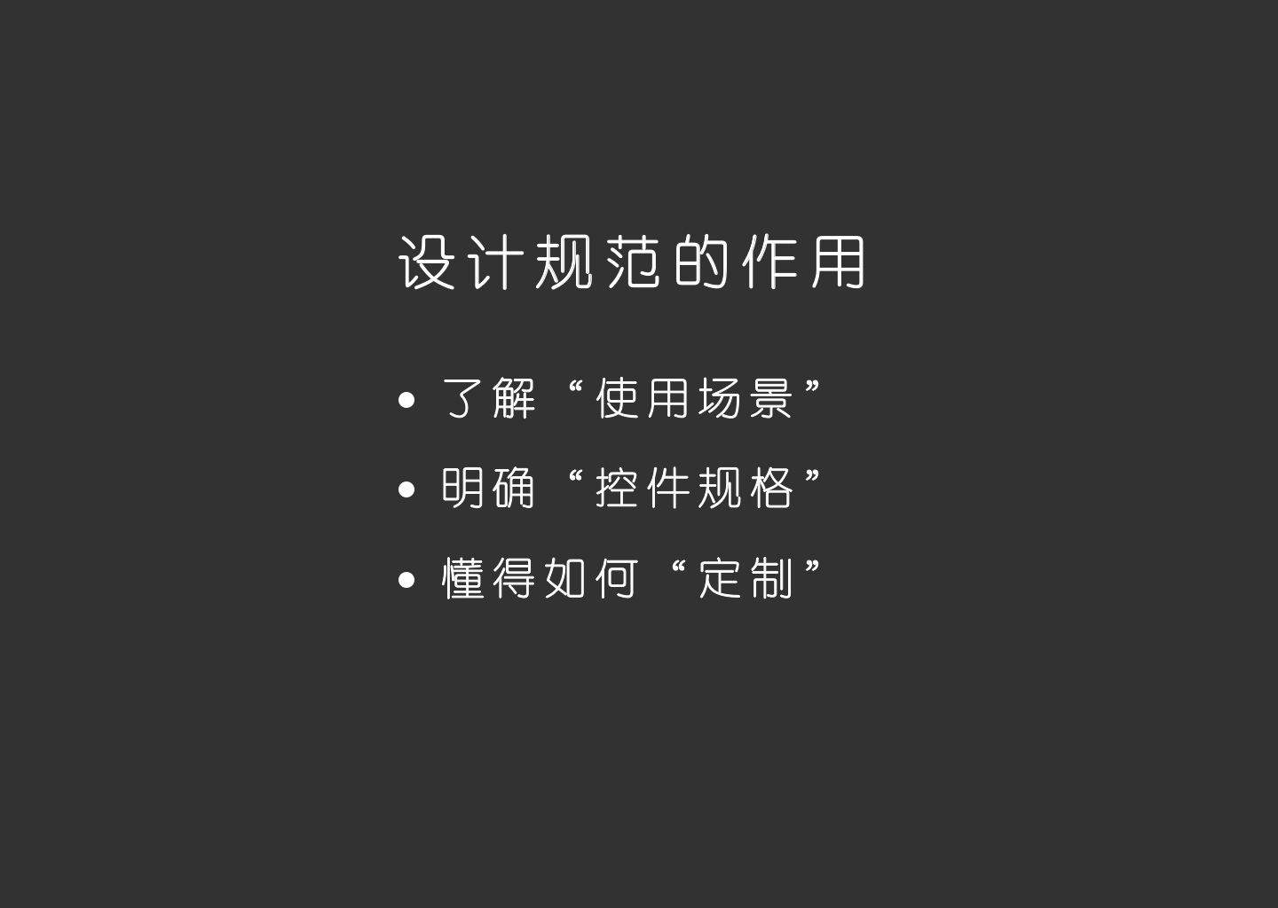 大家对“设计规范”所起的作用多少都有些了解。时常听到的声音包括有:“让工程师能清晰的知道如何去实现还原设计”;“设计团队有新小伙伴加入时能尽快熟悉相关产品的属性环节,快速上手。”具有一种对内、对外兼具的作用。