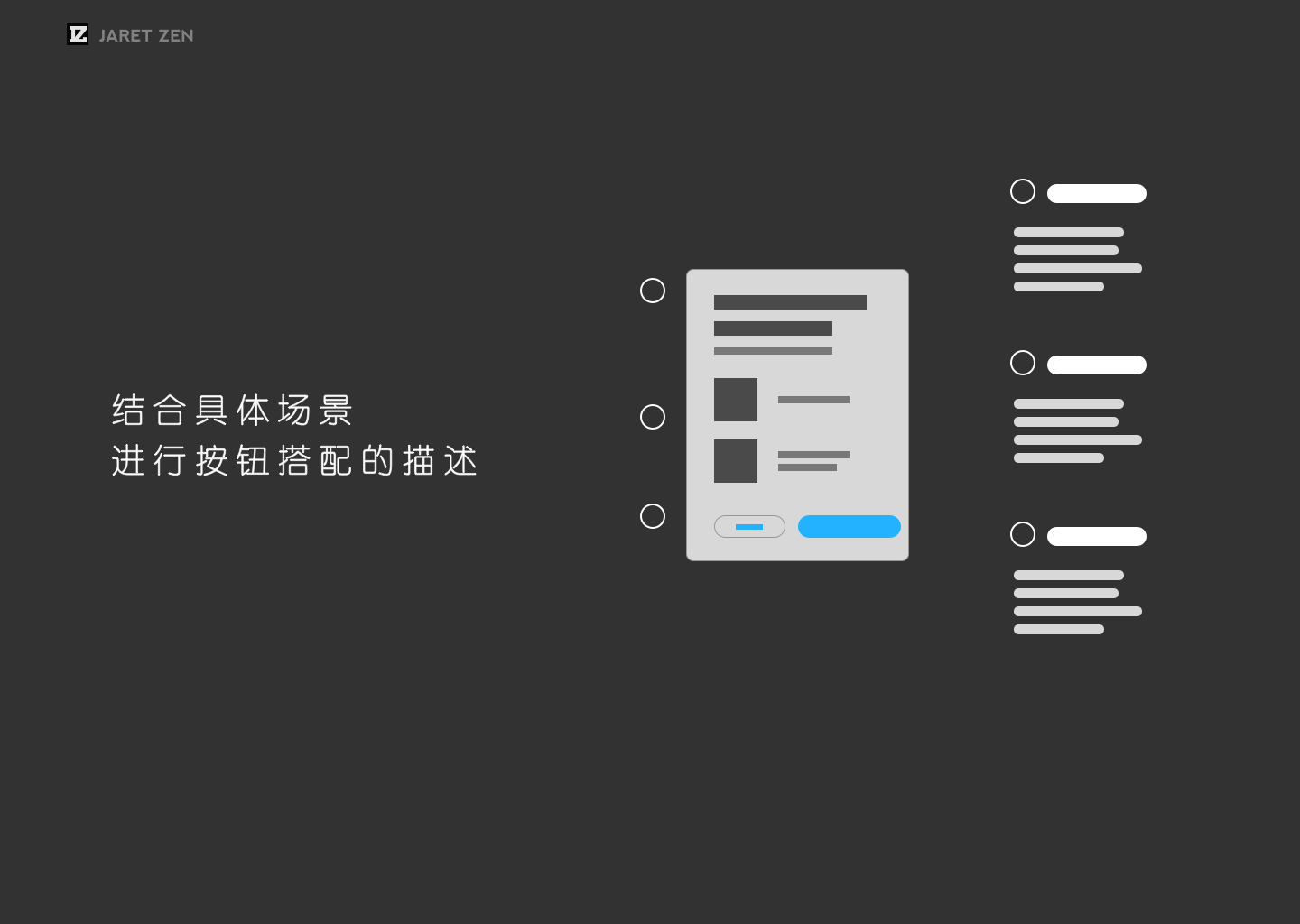 最后“核心按钮规格”的说明展示则让人更容易理解和体会之前在概述和场景下阅读到的内容,将两者串联起来,更利于阅读者正确消化。