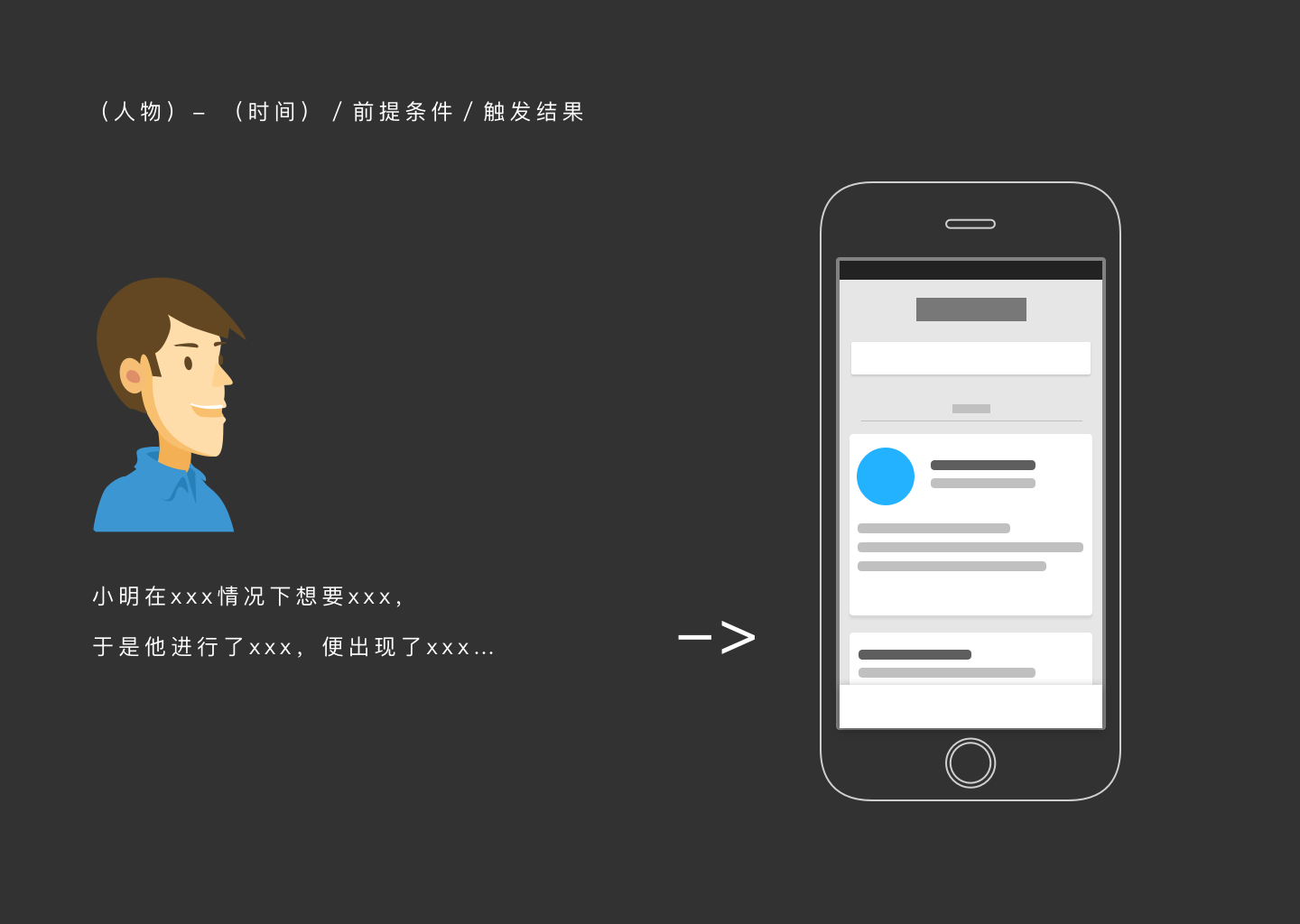 设置一个“人物”,讲述一段故事,引出一个使用实例,展示一张场景下的界面不失为一种有效的表述方式。