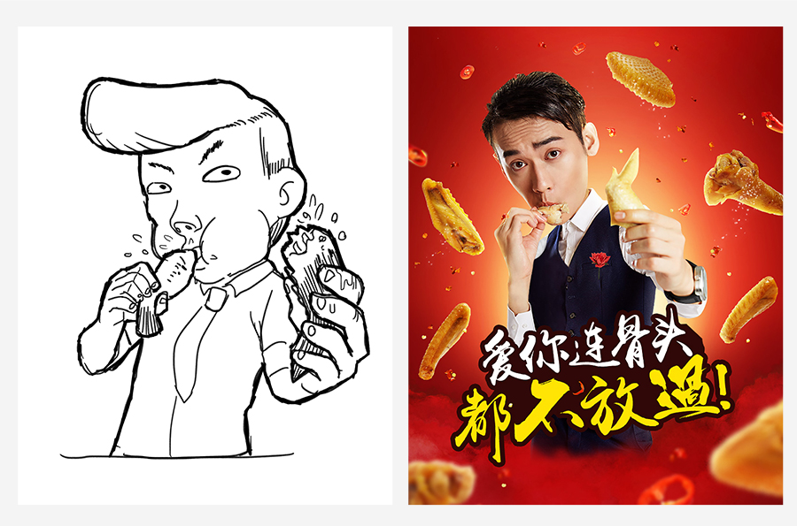 场景:模特嘴里塞着一直还没嚼完的鸡翅,另一只就已经拿在手里准备待命,皮滑骨脆停不下来。