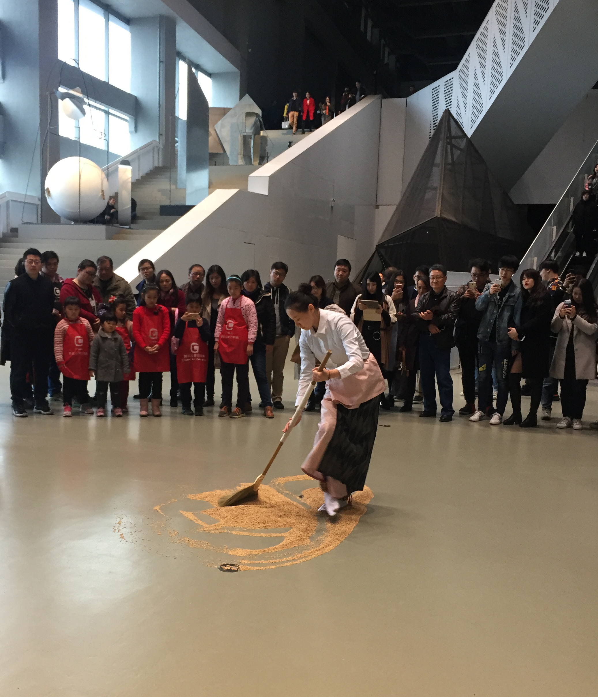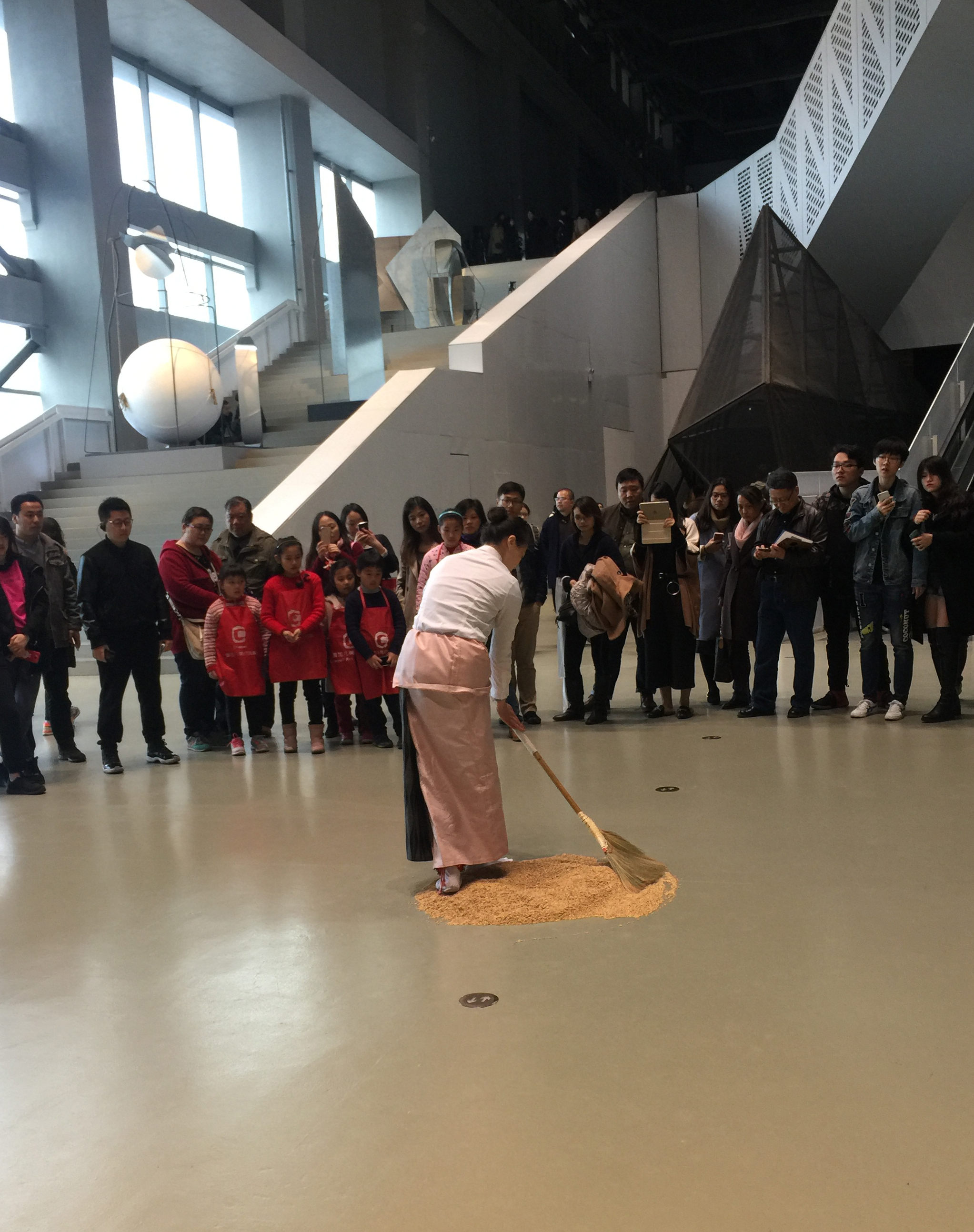 一位沉默的舞者,聆听自己内心世界的声音,追循曲径游走于诺大的展厅中央,并用手中的扫把扫拂地面上散落的谷物。形成一幅由内心创造出来的画面。