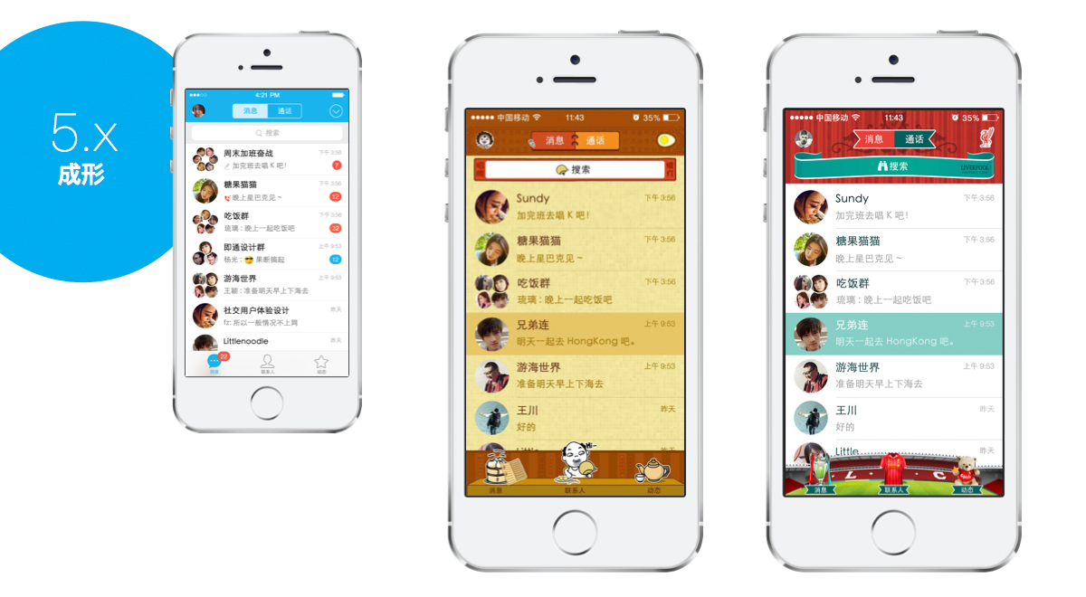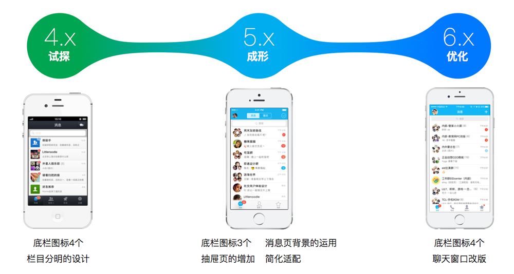 随着iOS7扁平风格化的普及,5.x版本的手Q改变也比较大,减少了条目感,整体扁平统一,去掉了渐变的使用,图标也改为现状。