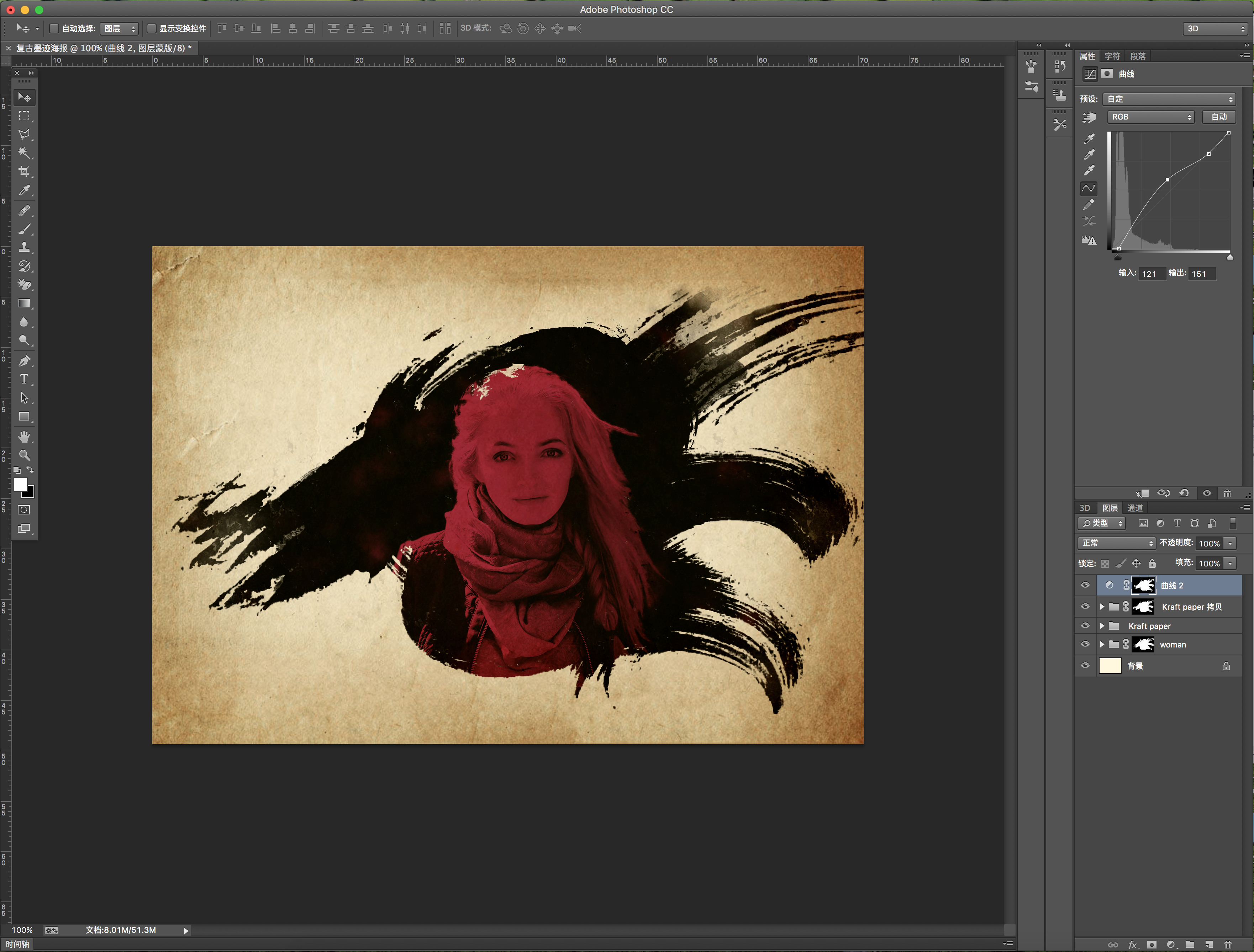 12、牛皮纸组混合模式调整为“正片叠底”,复制一层牛皮纸组添加墨迹蒙版,在墨迹选区内用“曲线”进行微调,如下。
