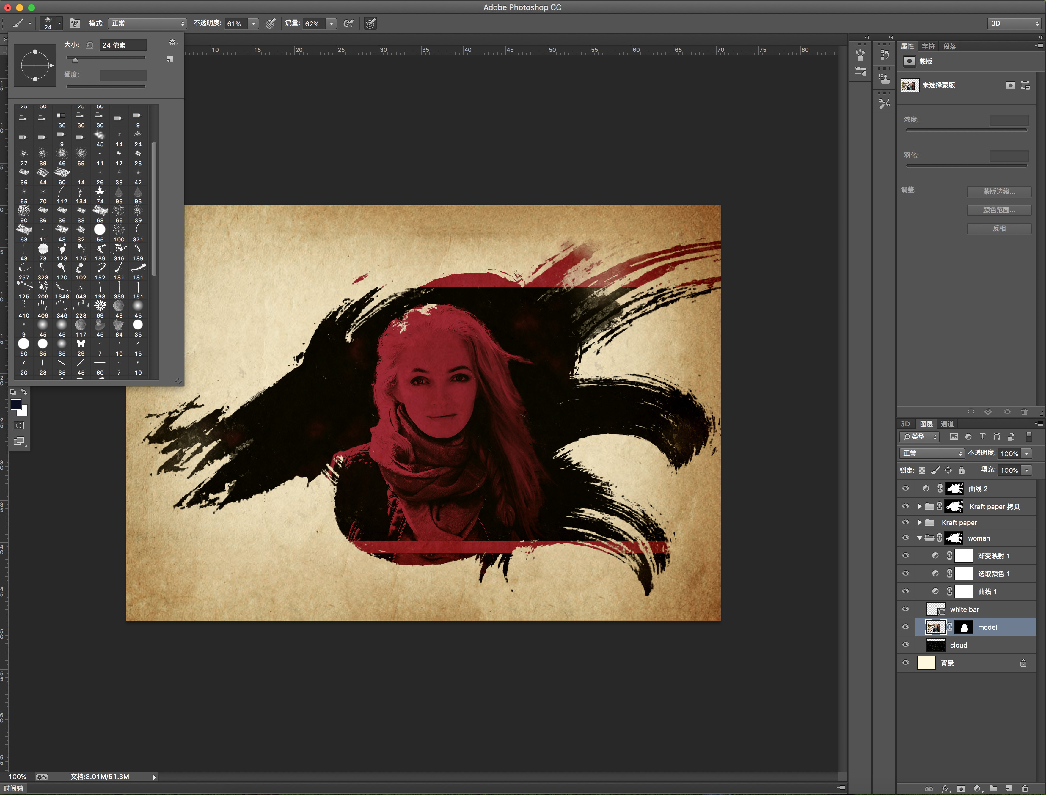 10、将人像用不同的墨迹笔刷叠加刷出来如下(刷的时候注意,白色为前景色)