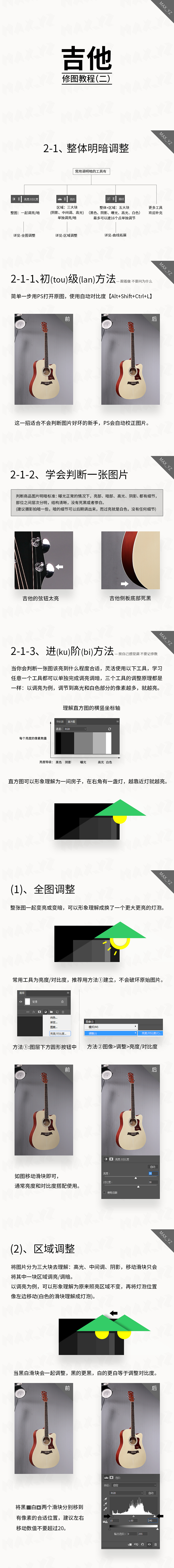 教程主要是关于吉他修图,教程(二)是关于PS基础调明暗工具介绍:亮度/对比度、色阶、曲线。