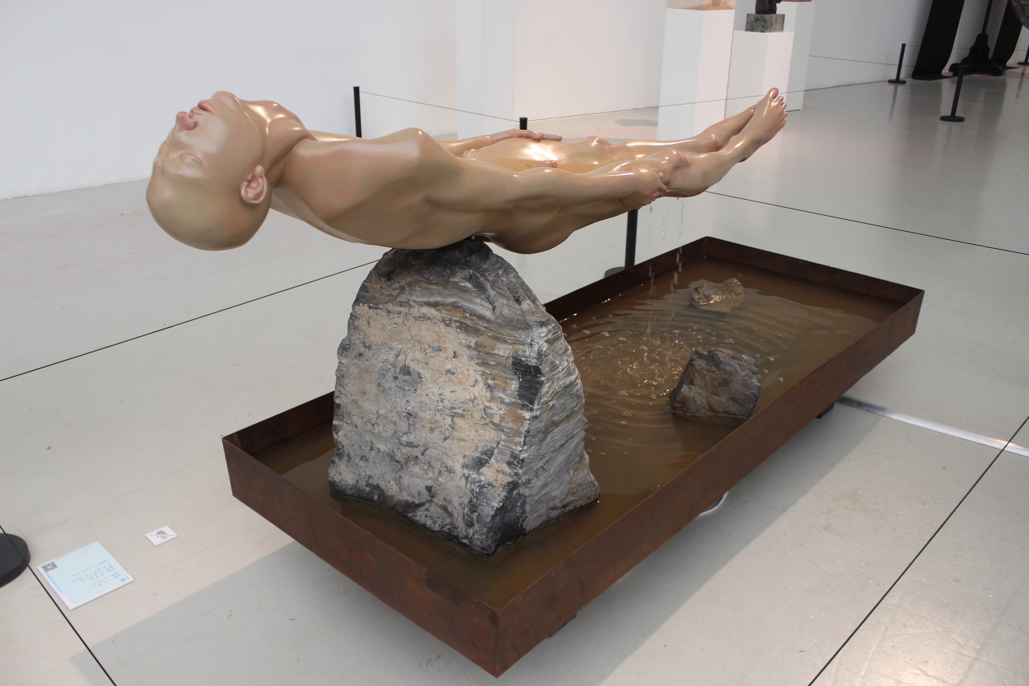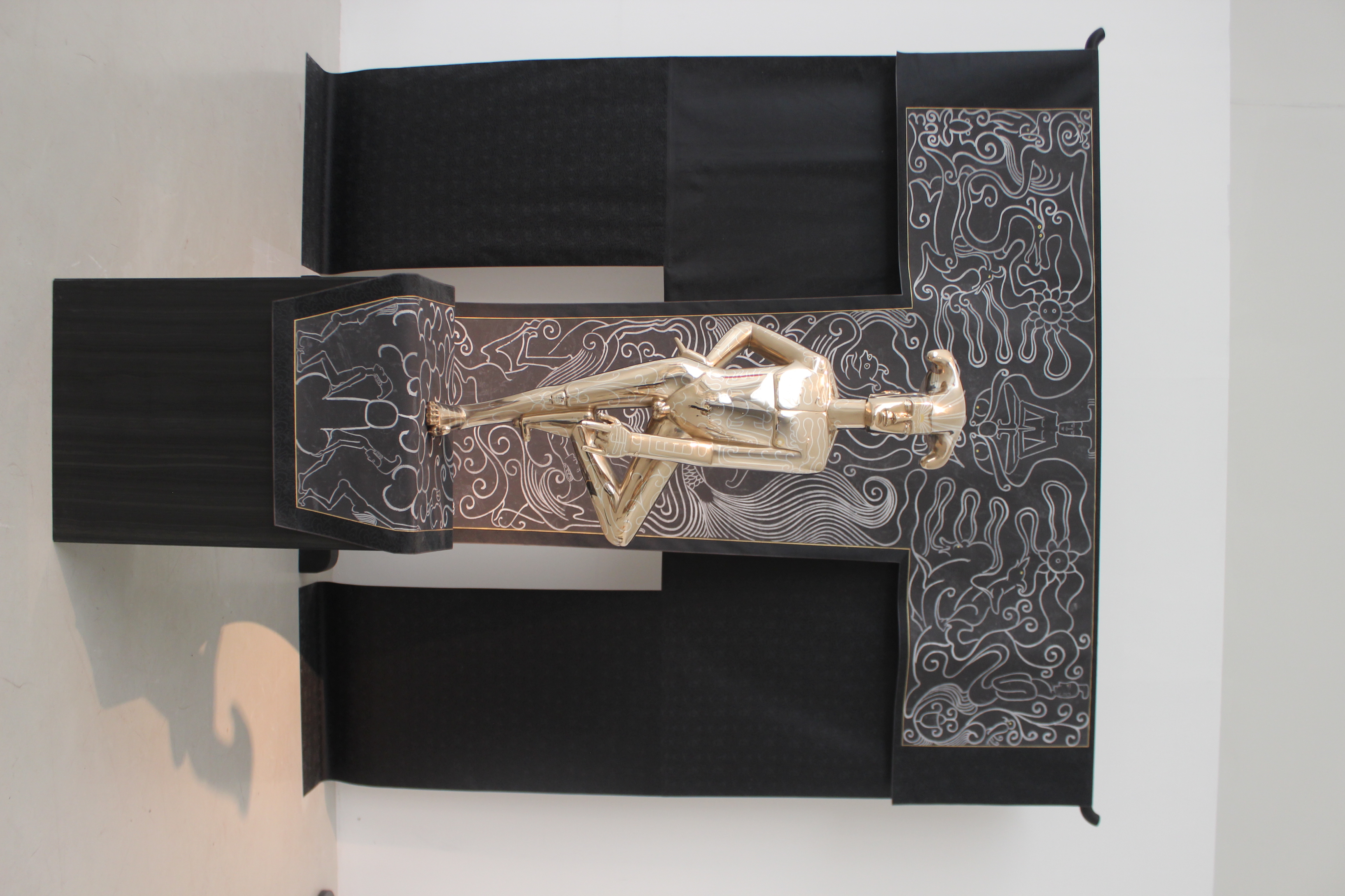 设计说明:本作品是对后青春阶段性状态的一种诠释,展现出释怀飘逸、积极上进的后青春状态。雕塑运用了传统“金银错”工艺,这种工艺始于2000多年前的春秋中期,先在青铜表面预先铸出或錾刻出图案所需的凹槽,然后嵌入金银丝、片,反复捶打牢固,再用砂纸将其打磨抛光,达到突出图案的装饰效果。