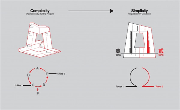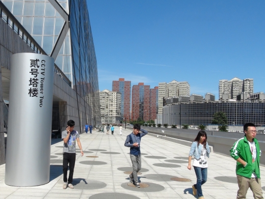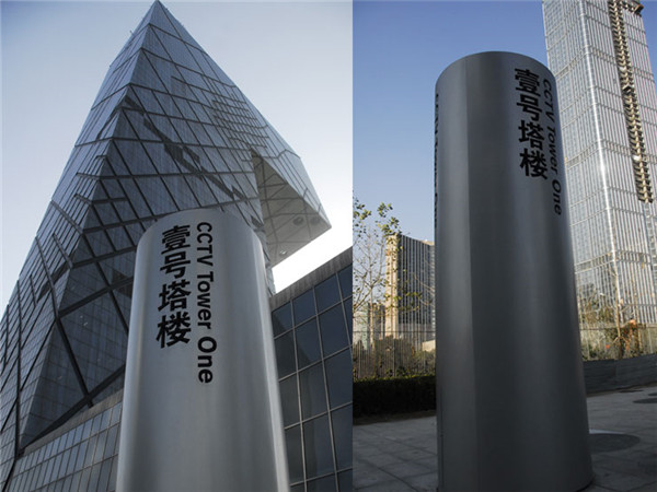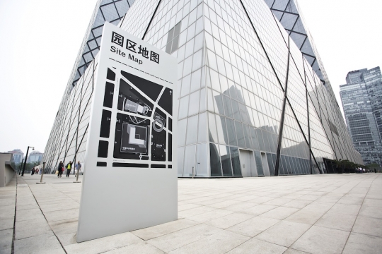 由OMA设计的CCTV中央电视台总部,紧邻北京东三环,地处CBD核心区,是一个相对传统直立摩天大楼的“异形”大型建筑,可容纳10000名工作人员。该建筑体量巨大,功能繁杂、人流众多,因此相应的各种标识和导向系统方案也亟待呈现。