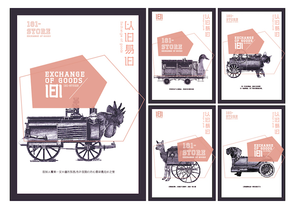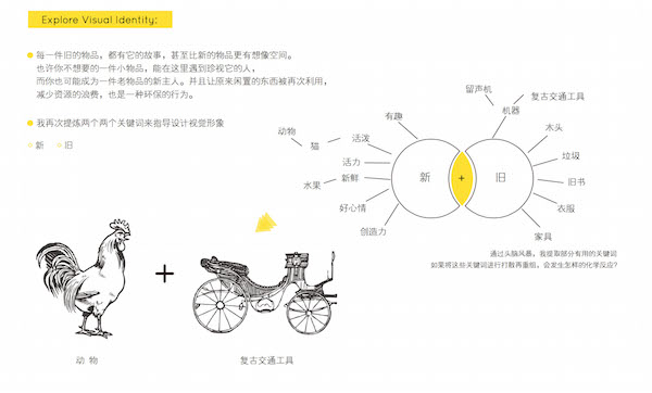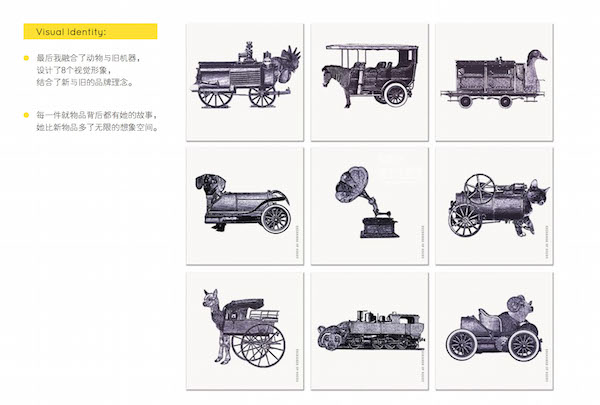 我们收集了大量关于表达新旧主题的视觉元素,最后融合了动物与旧机器,设计了8个视觉形象,结合了新与旧交替的品牌理念。每一件就物品背后都有她的故事,她比新物品多了无限的想象空间。