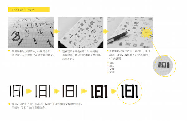 最开始我们过分强调logo的视觉化和图形化,从而忽略了品牌本身的意义,也发现了所有手稿都和181杂货铺没有联系,意识到和客户的沟通非常不足。于是重新和委托进行一番探讨,通过沟通,谈话,我提炼了这个品牌的4个关键词:181,复古,交换,文字。