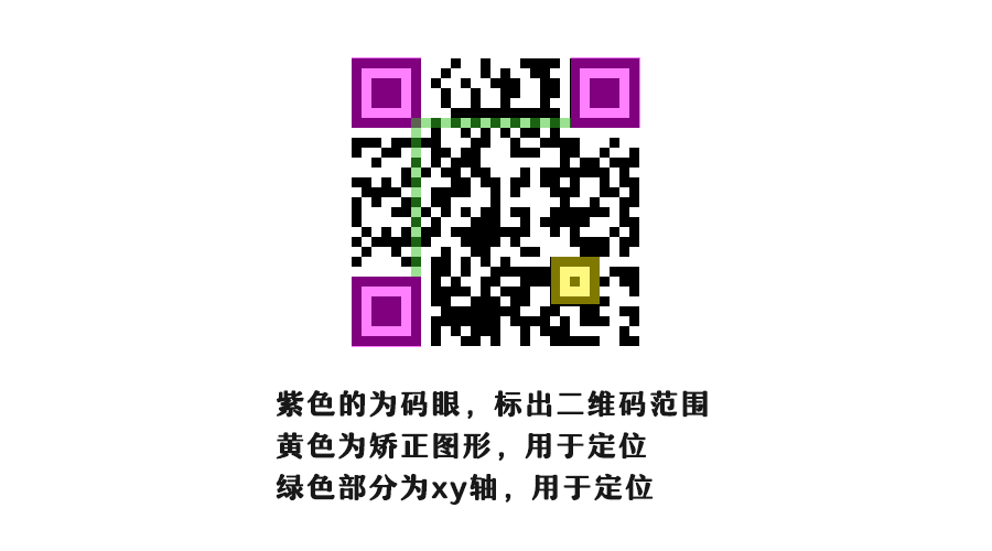 我:啊,你听我说完嘛,二维码虽然都是以二进制01构成的。但是还有几个特殊的地方,首先上面我们提到的方向性的问题。就是为什么我们从不同角度扫描二维码都可以识别呢。其主要就是这三个”眼睛“确定了面积范围之后,中间相交的xy轴在作祟。这三个”眼睛“我们称之为码眼。顾名思义就是二维码的眼睛。起识别二维码范围的作用,而xy轴即确定了二维码的方向。