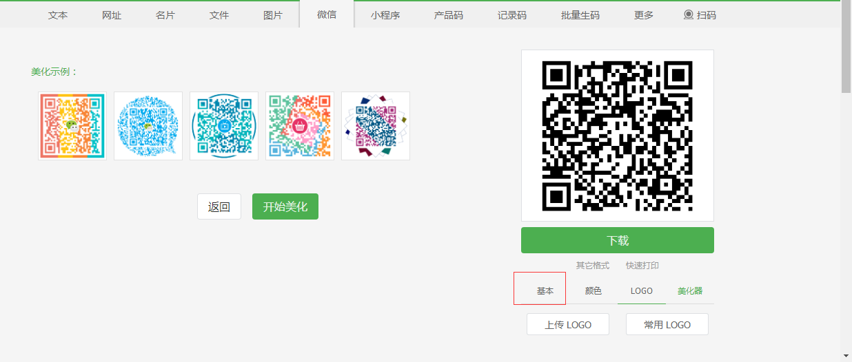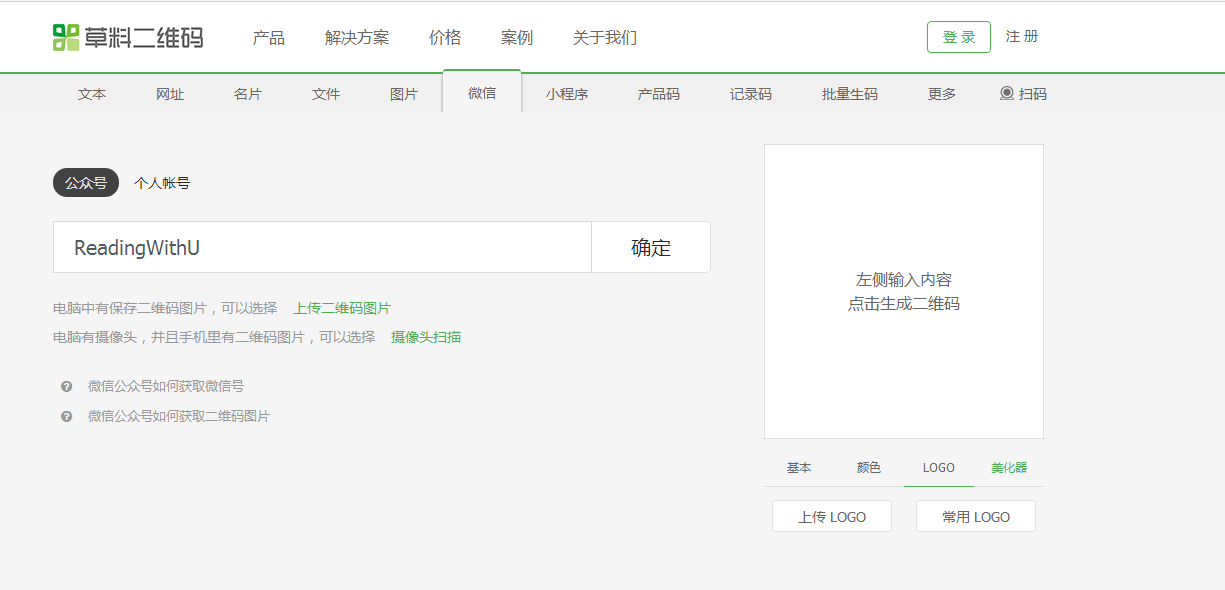 我:这就尴尬了,还要自己这样一个个计算然后排整齐的话,那就不用搞生产了。科技发展到今天肯定有快速生成二维码的工具吖?比如说“草料二维码”这个网站。你可以直接将文字、图片、网站链接甚至微信公众号都可以直接生成二维码。