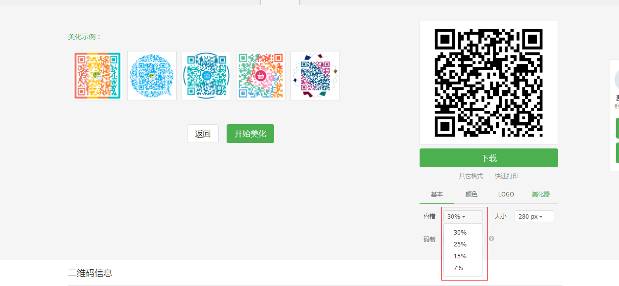 我:咳咳,当然这样生成二维码方便快捷而且不容易出错。其实二维码还有一个容错机制。就是当一个二维码遮住一部分甚至毁坏一部分后都还可以识别。我们称之为容错率。二维码的容错率有7%、15%、25%和30%就是当遮住二维码的部分都可以识别出来就要看容错率的机制了。容错率越大二维码越是复杂,其实就是备份了几份,当一部分遮住的时候另一部分也可以识别出来。